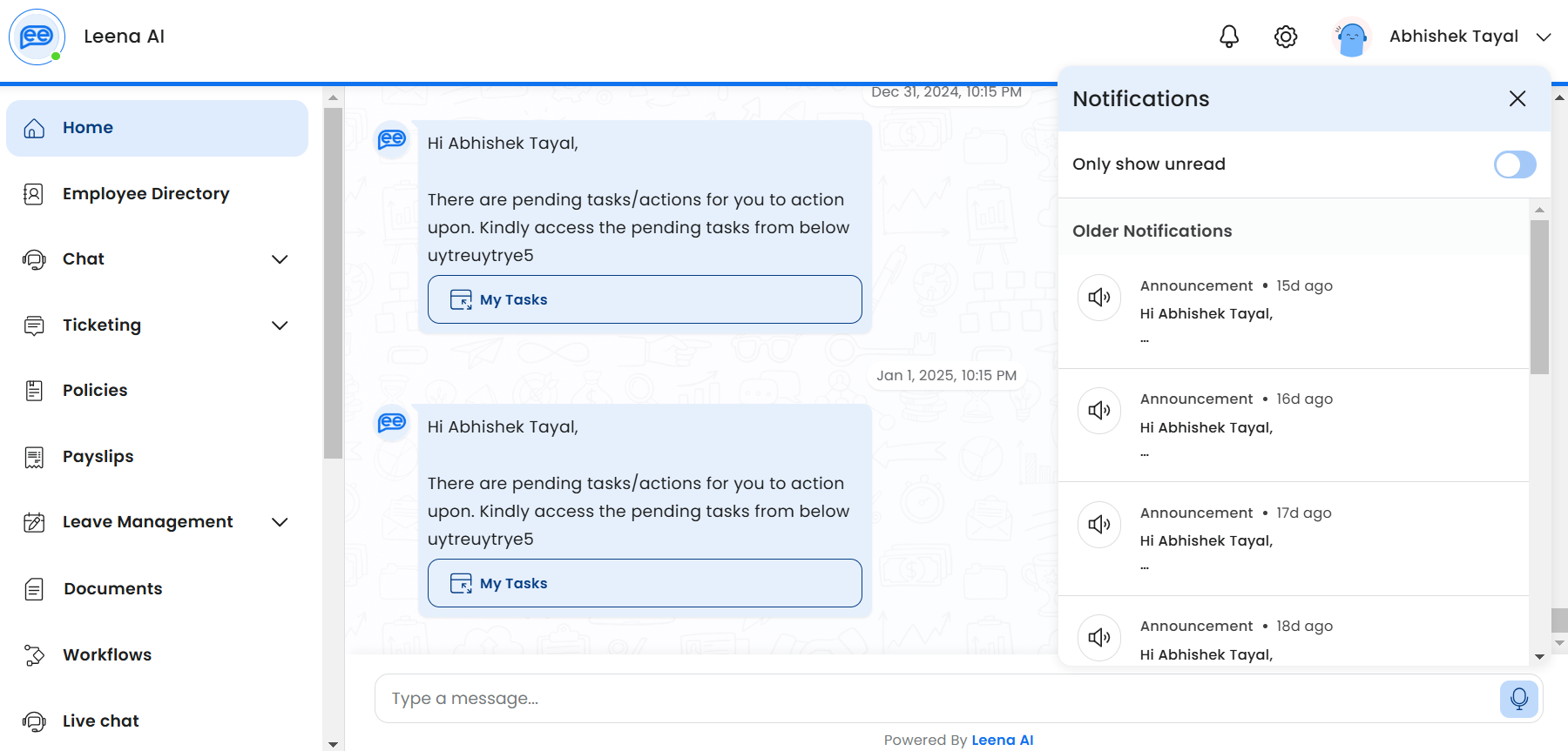 - The notifications are segmented into multiple categories ranging from Announcements, Updates, Software updates, Payslip, Clock in/out to Workflows and more.