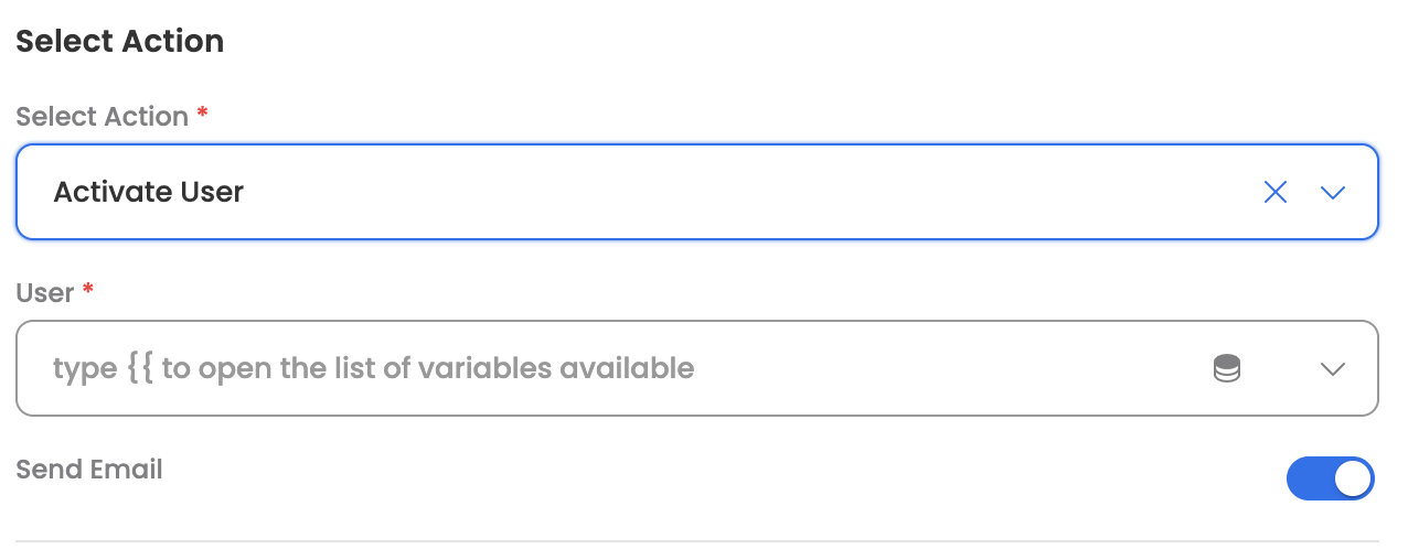 | Send email | Send activation email to user | true/false |