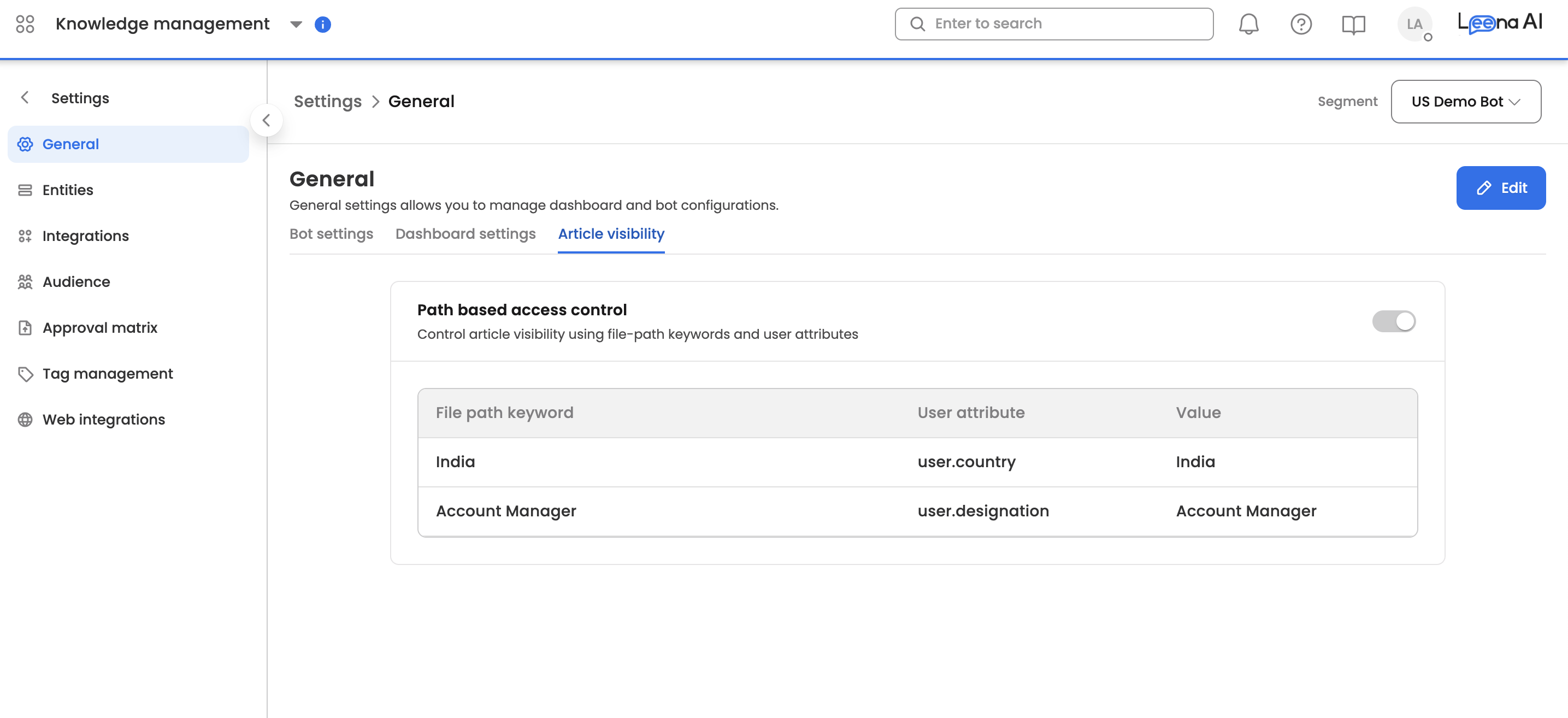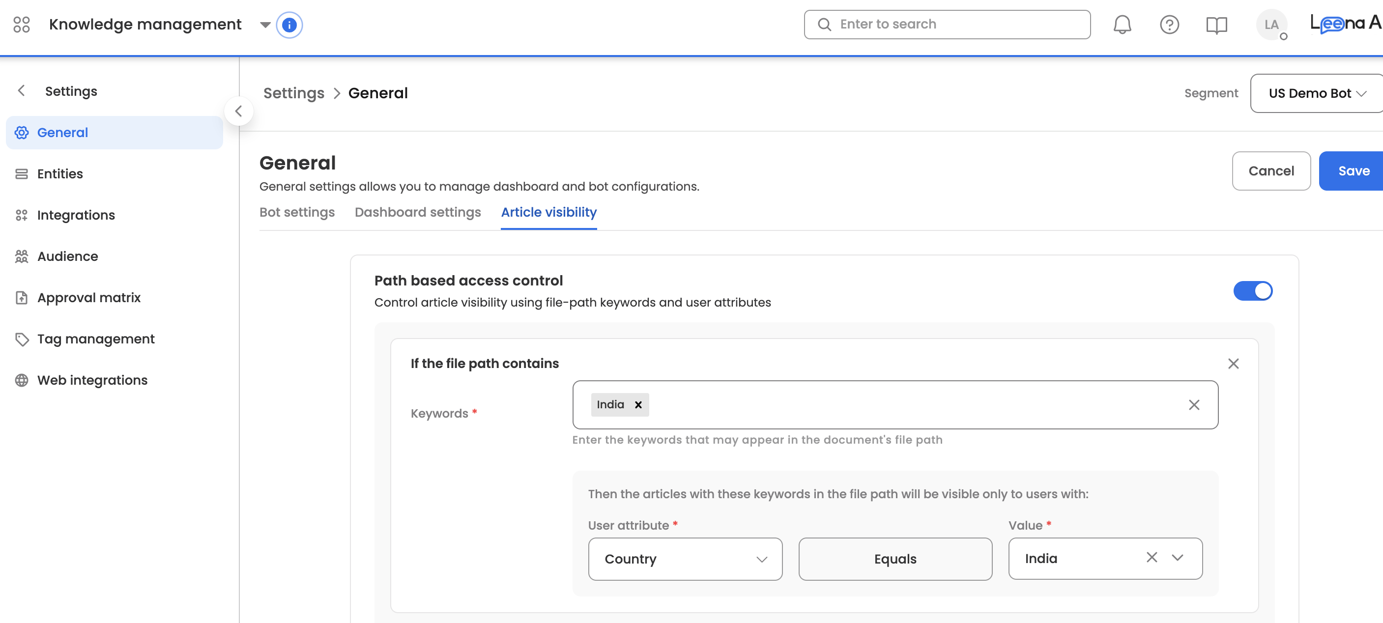 Path: Settings > General Settings > Article Visibility > Path based access control