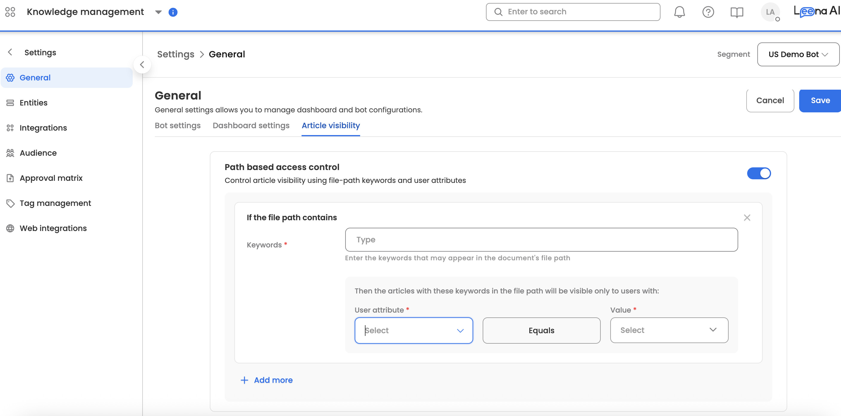 While connectors like SharePoint and Google Drive provide base permissions, they are often too broad. Path-Based Access Control (PBAC) allows Admins to enforce stricter visibility by scanning file paths for keywords and requiring matching User Attributes (e.g., user.country, user.manager) for access.