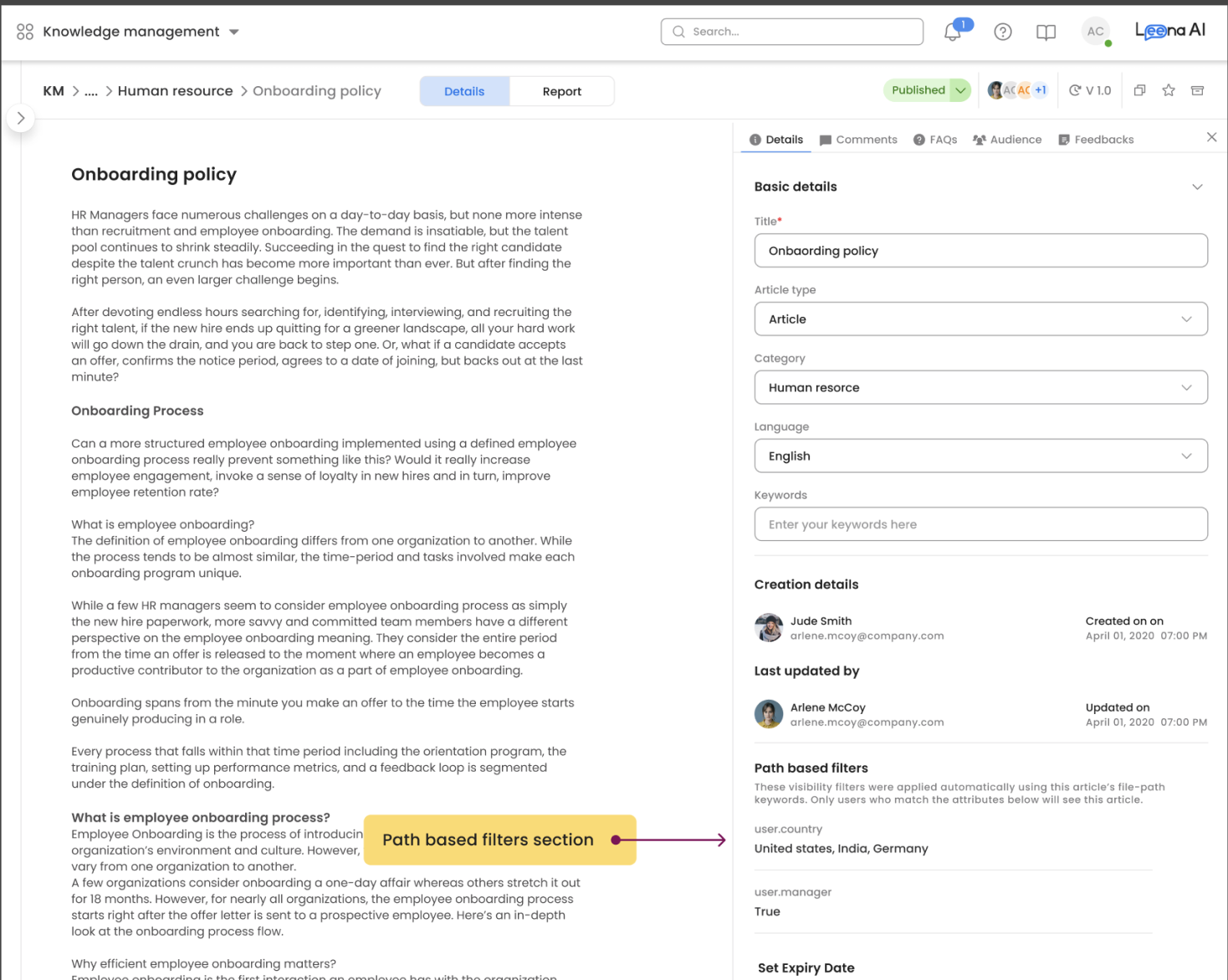 Admins can view active filters directly on an article's Details page under the section Path Based Filters.
