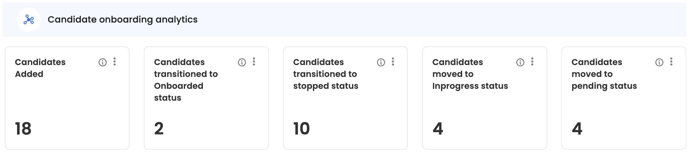 The top view cards provide a numerical indicator of the overall activity by onboarding dashboard users in the selected time range, such as candidate addition, candidates transitioned to onboarded/stopped status etc.