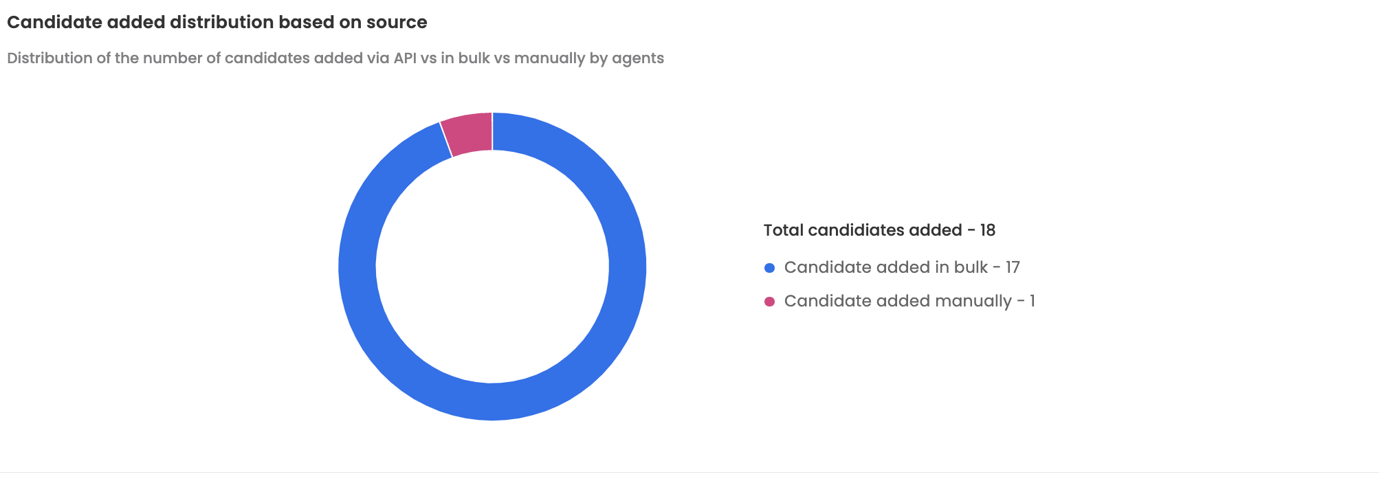 Presents a pie chart which displays the distribution of the number of candidates added via API vs in bulk vs manually by agents within the selected time period.