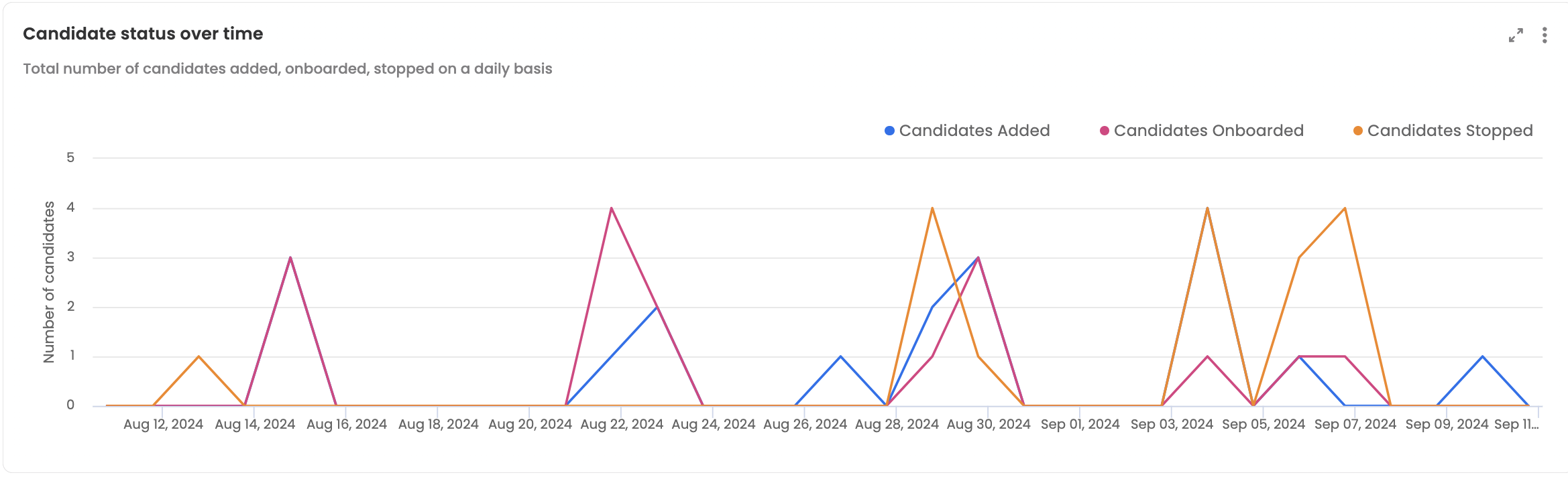 Provides a timeline view of the total number of candidates added, onboarded, stopped on a daily basis.
