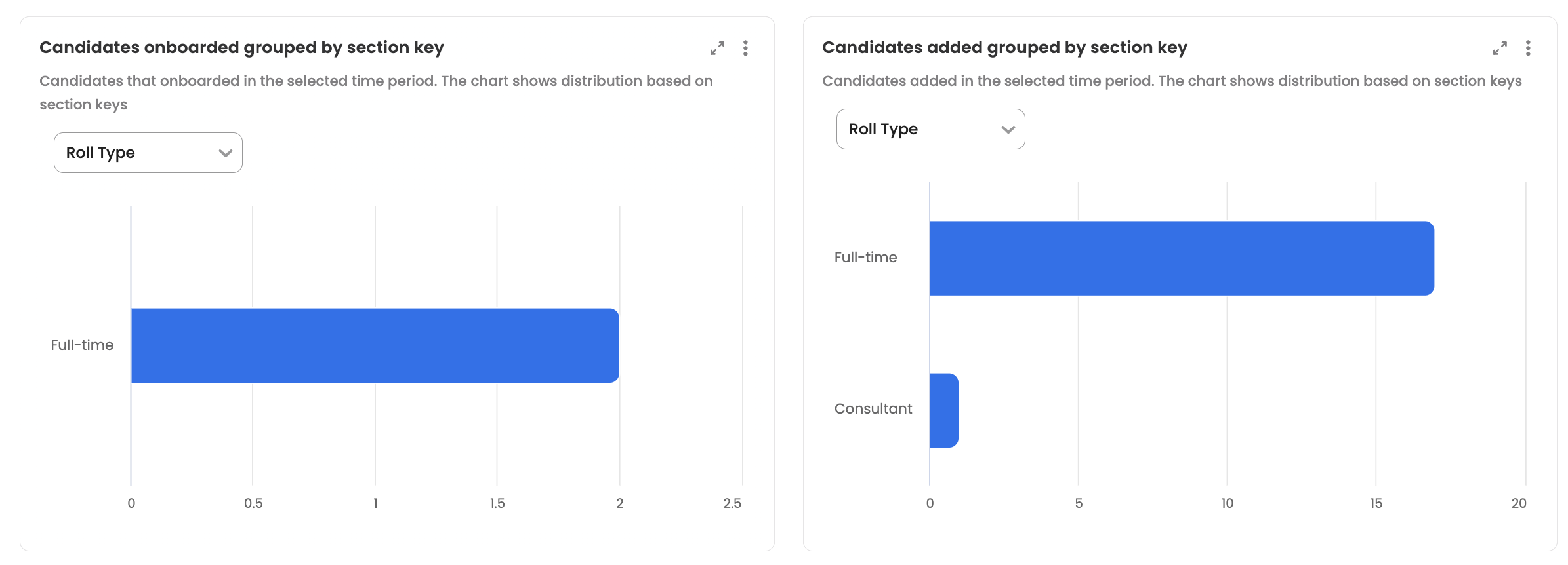 Bar chart on the number of candidates that were onboarded/added in the selected time period. The chart shows distribution based on section keys which can be selected via the dropdown.