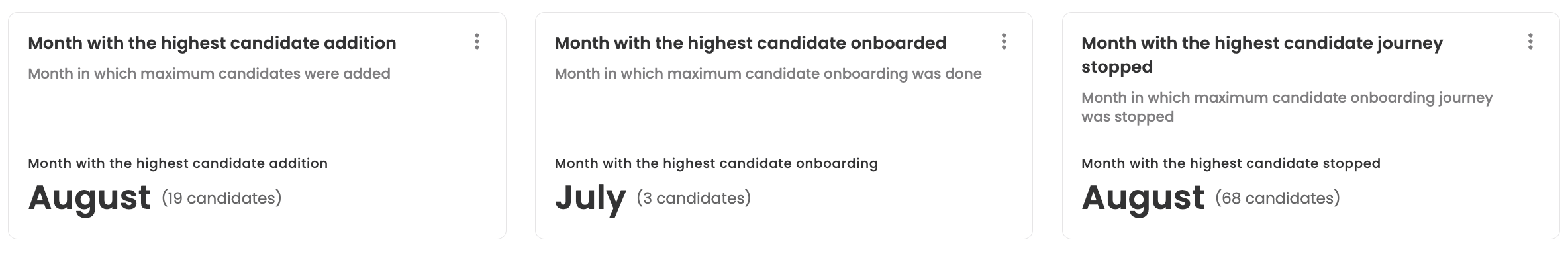 These cards provide the information related to the month which had the highest candidate addition/onboarding/journey stopped.