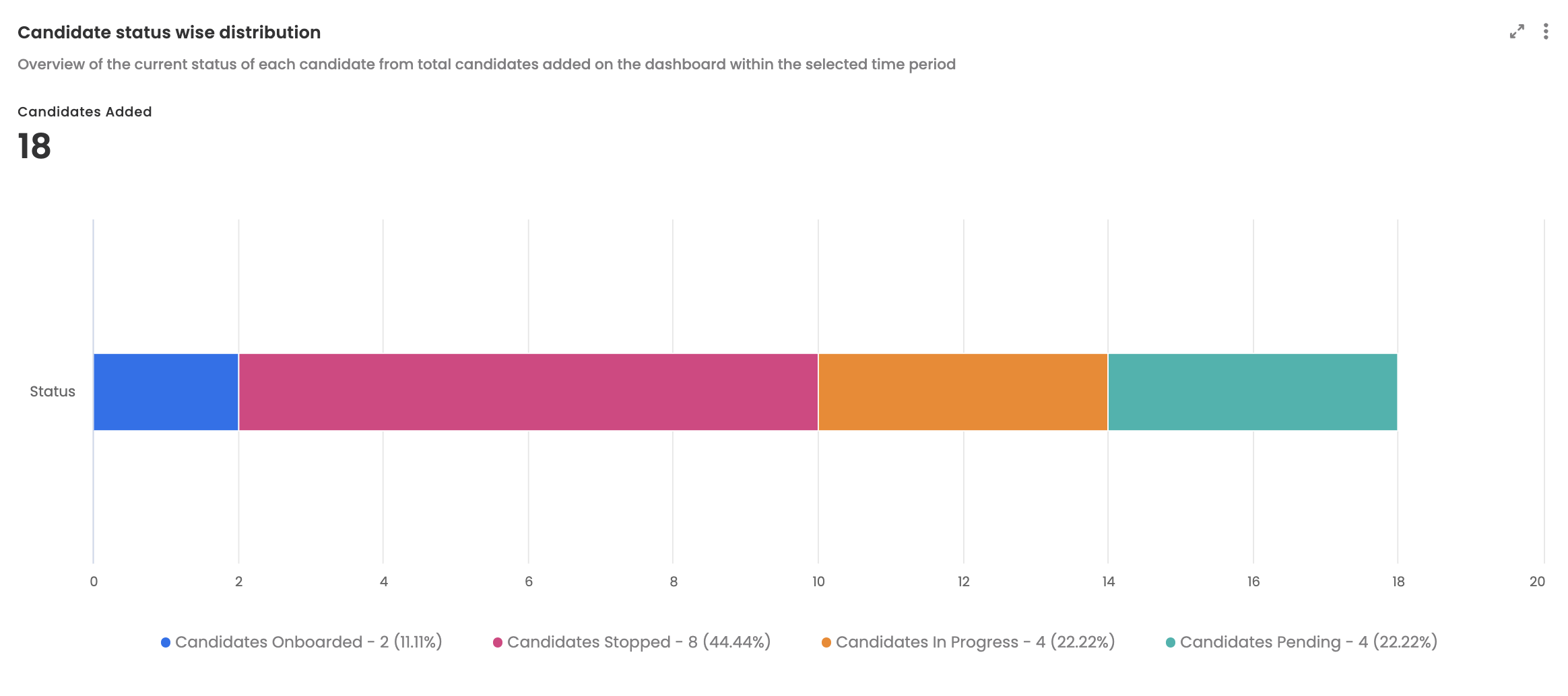 Provides an overview of the current status of each candidate from total candidates added on the dashboard within the selected time period.