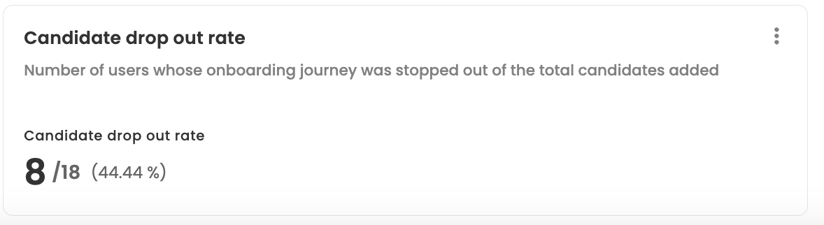 Provides information on the number of users whose onboarding journey was stopped out of the total candidates added within the selected time period. This metric helps users understand if their attrition rate regarding to the onboarding/offboarding journey.