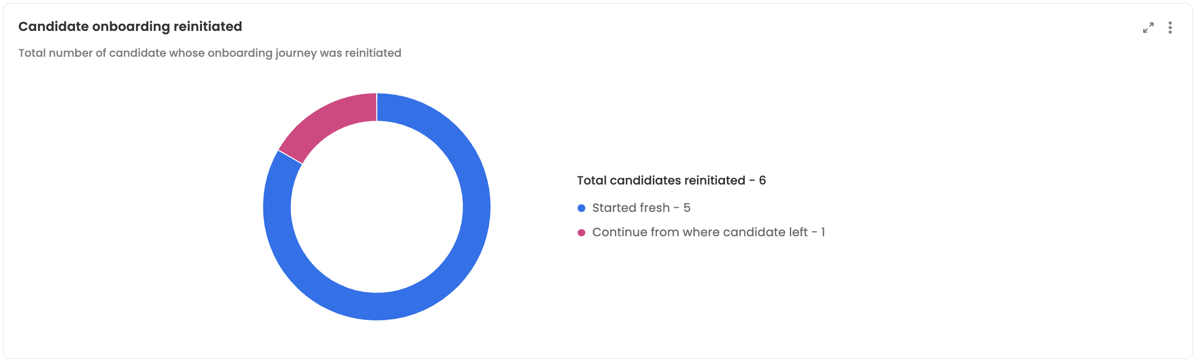 Provides a pie chart that shows the total number of candidate whose onboarding journey was re-initiated along with the option chosen (start fresh/continue from where candidate left) for re-initiation.