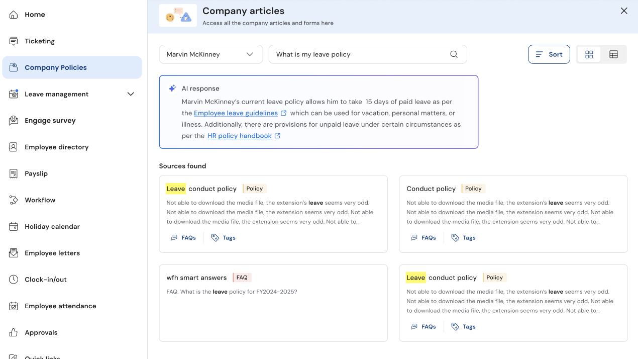 Contextual Scoping: The search bar automatically filters results based on your active view. If you are viewing the policies of your reportees, the search only scans documents that the selected employee has permission to see.