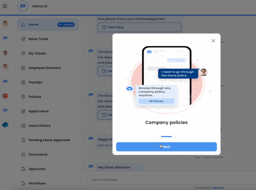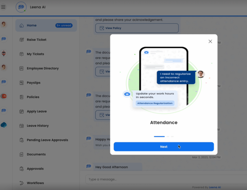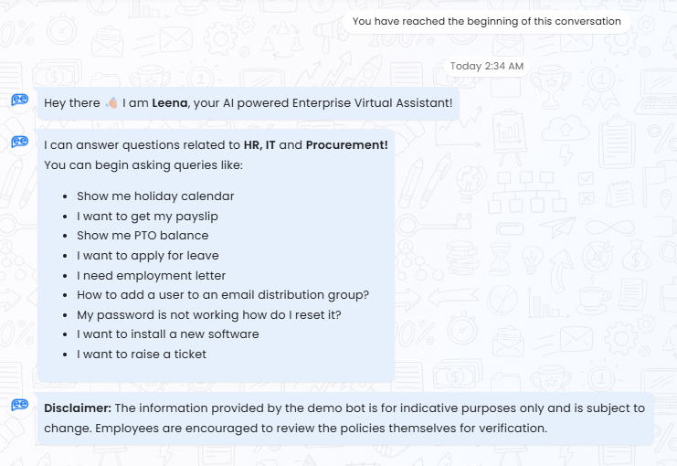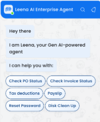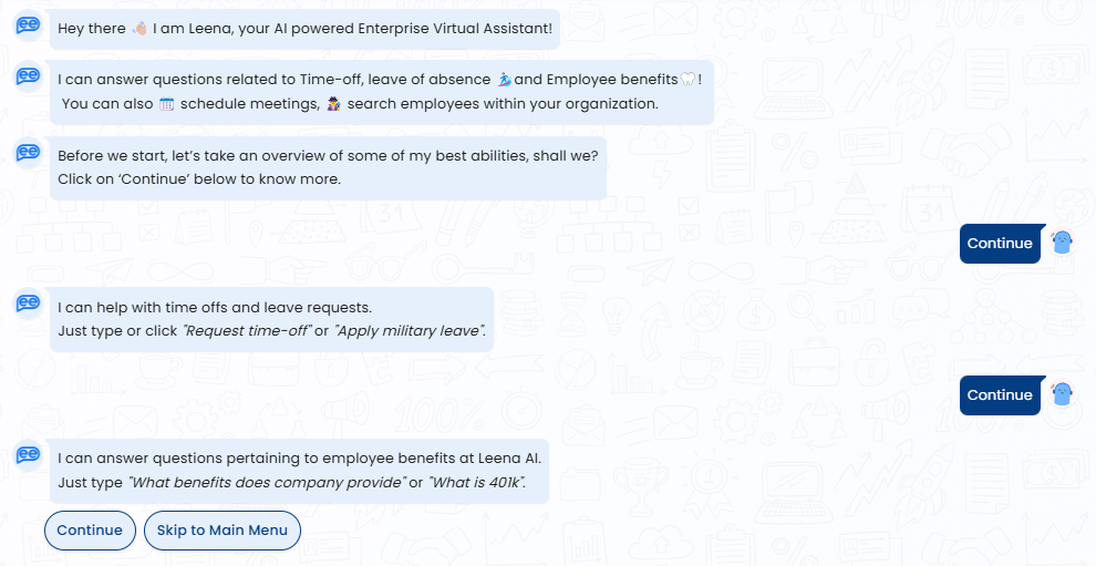 The Leena AI virtual assistant provides users with an introduction/tour of its capabilities to the user(s) on their first visit. The same can be shown in 3 ways