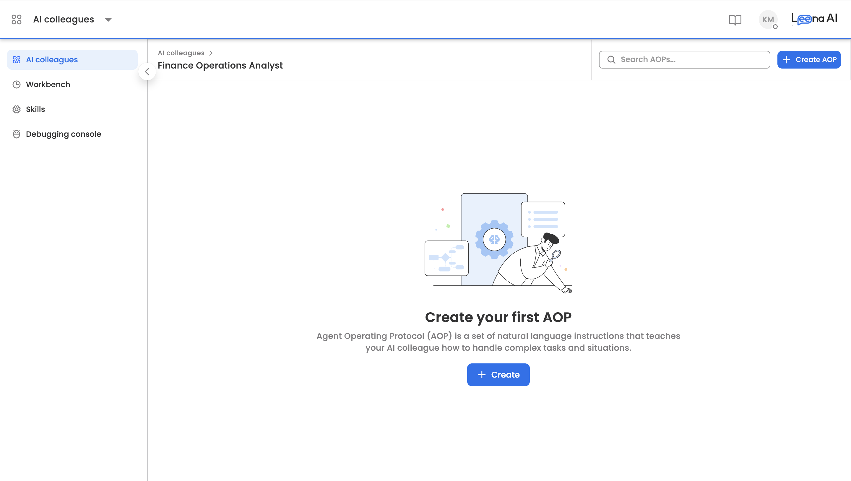 Once you create an AI Colleague from scratch, you would land on empty page to start creating AOPs