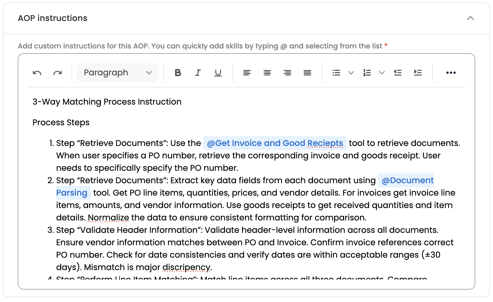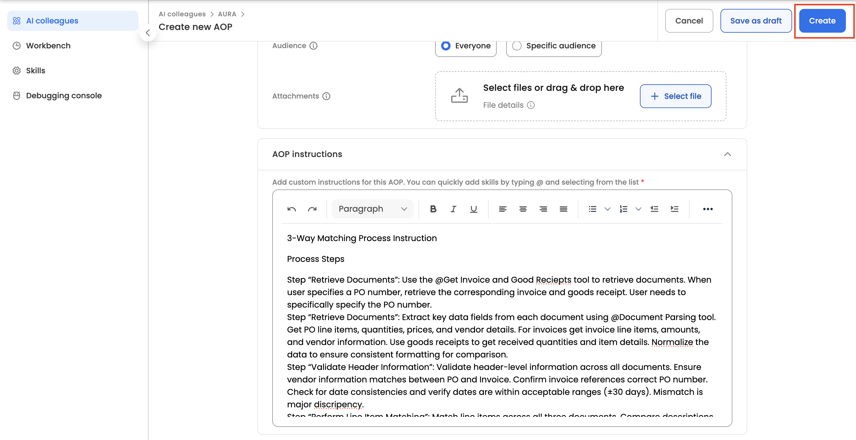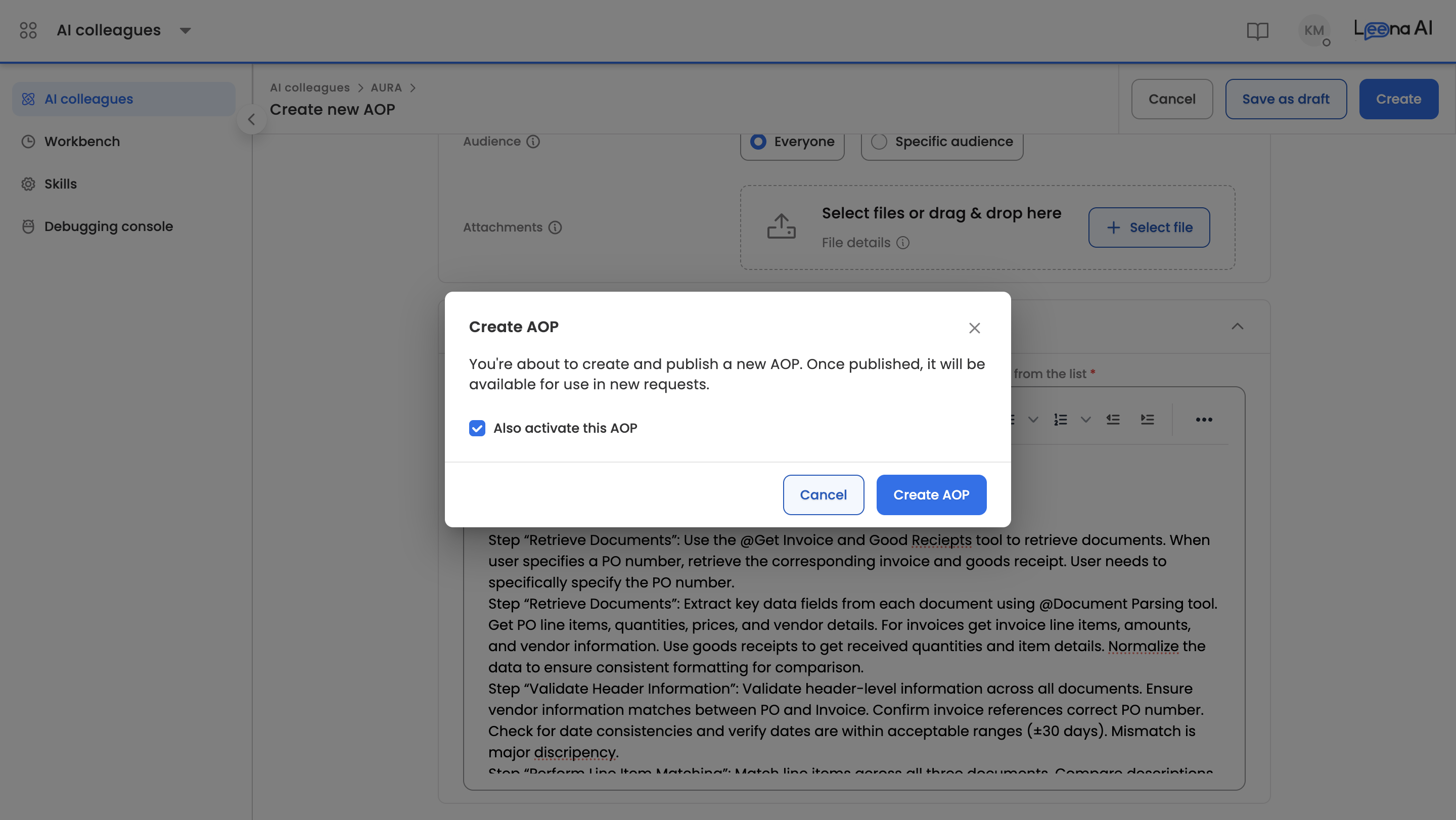 - By default, an AOP is marked as Active at the time of creating it. Once marked as active, an AOP is enabled for utilisation by AI Colleagues.