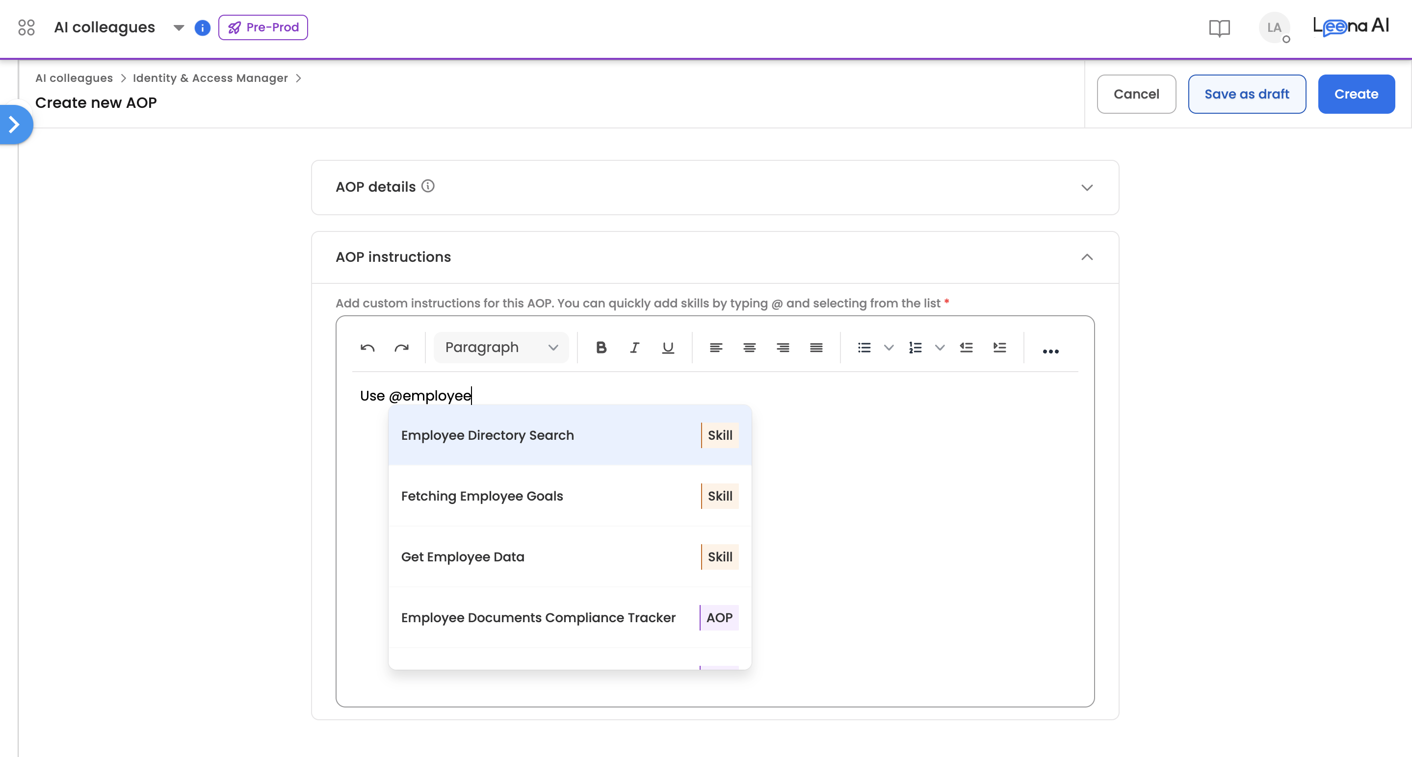 When writing AOP instructions, you can quickly reference other AOPs (primary or helper) and skills using the @ symbol. This allows you to seamlessly integrate existing components into your AOP workflow without manually searching for them.