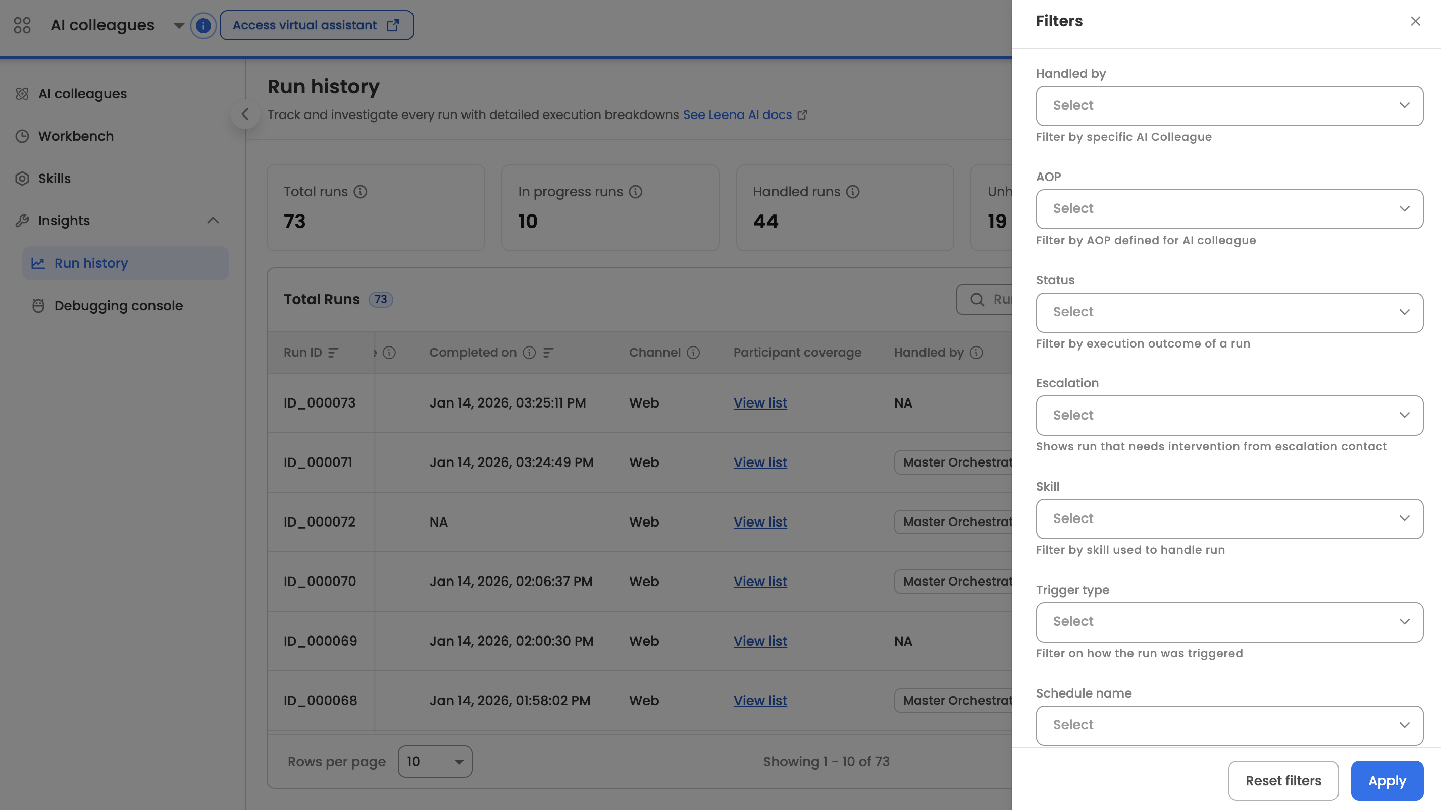 | Handled by | AI Colleague(s) that handled the request/run. |