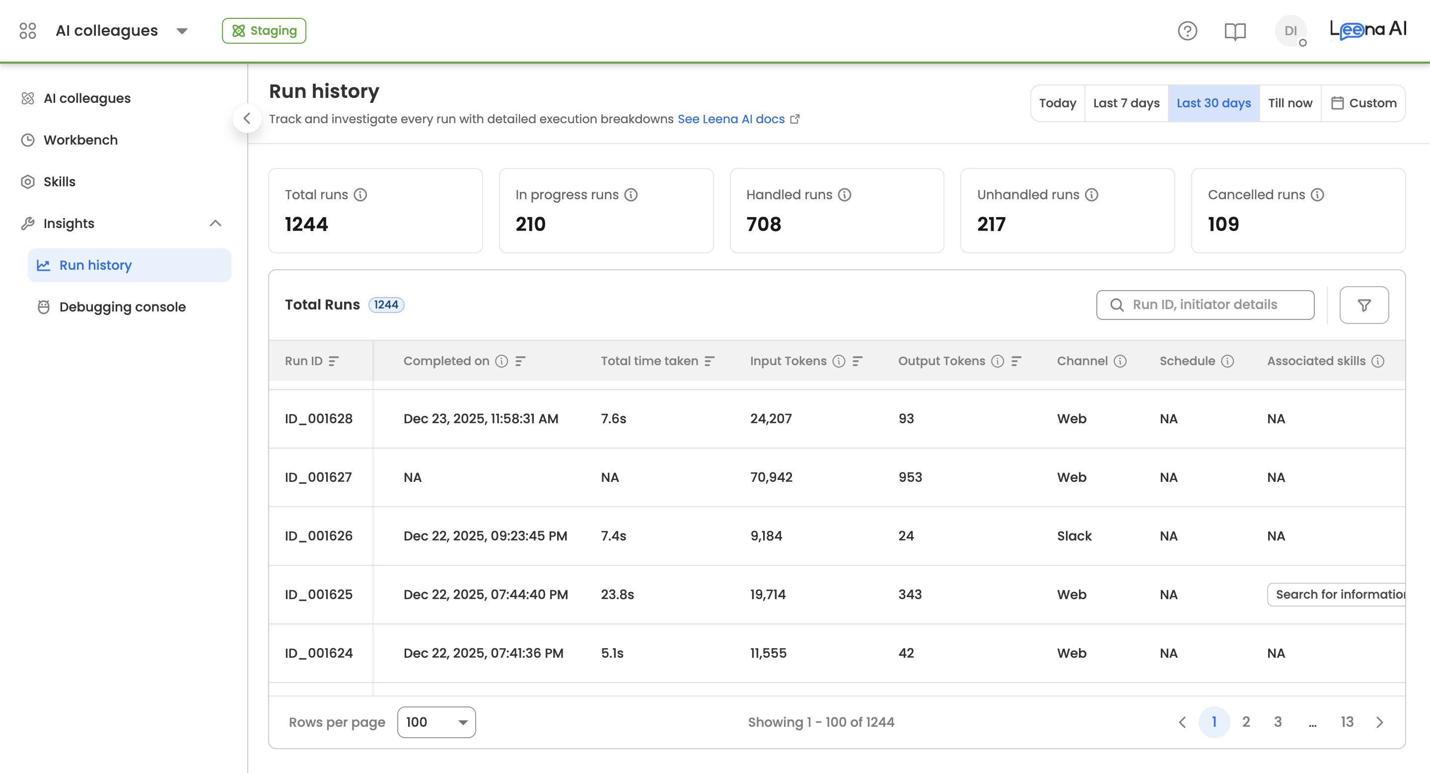 Run History provides comprehensive visibility into all AI Colleague executions across your organisation. It enables administrators, managers, and implementation teams to monitor performance, troubleshoot issues, and analyse business outcomes through a centralised dashboard.