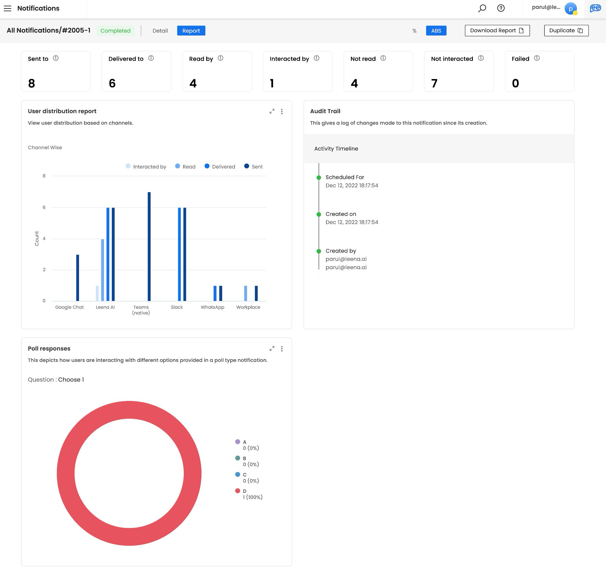 - Read by - Total unique users for whom the notification read acknowledgement was received by the system. In case of email notifications, it will represent open rates of the emails
