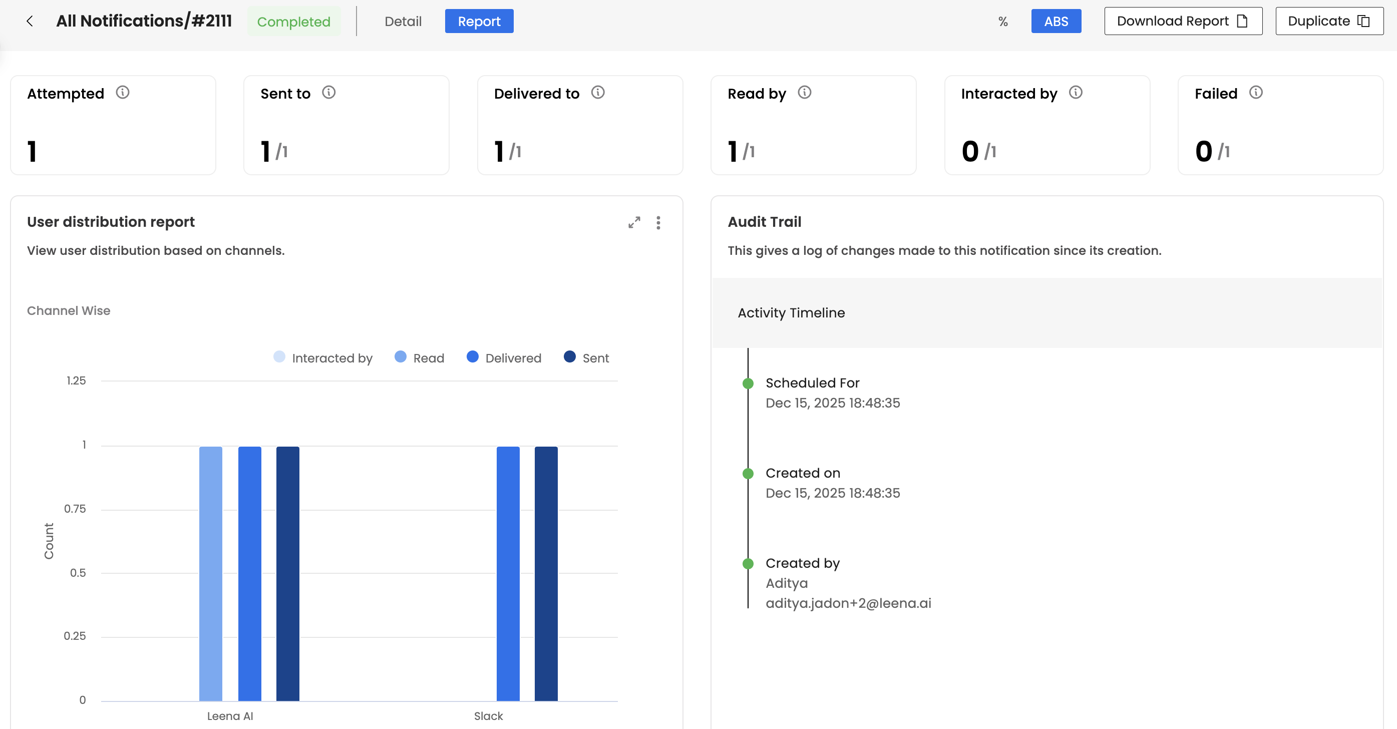 - Per channel metrics – how this notification performed on each channel (Email, WhatsApp, etc.).