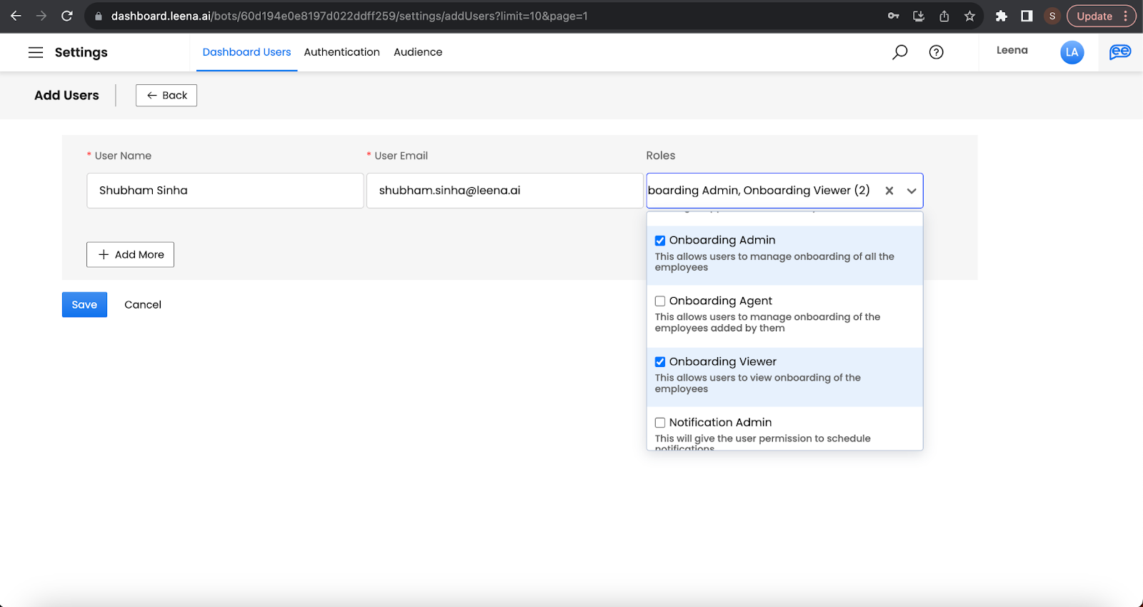 All the Onboarding users will be added to the dashboard through the settings page of the unified dashboard. While adding the users, the admin will have to define whether the added member will act as an onboarding Admin/Agent/Viewer, as shown in the image below.