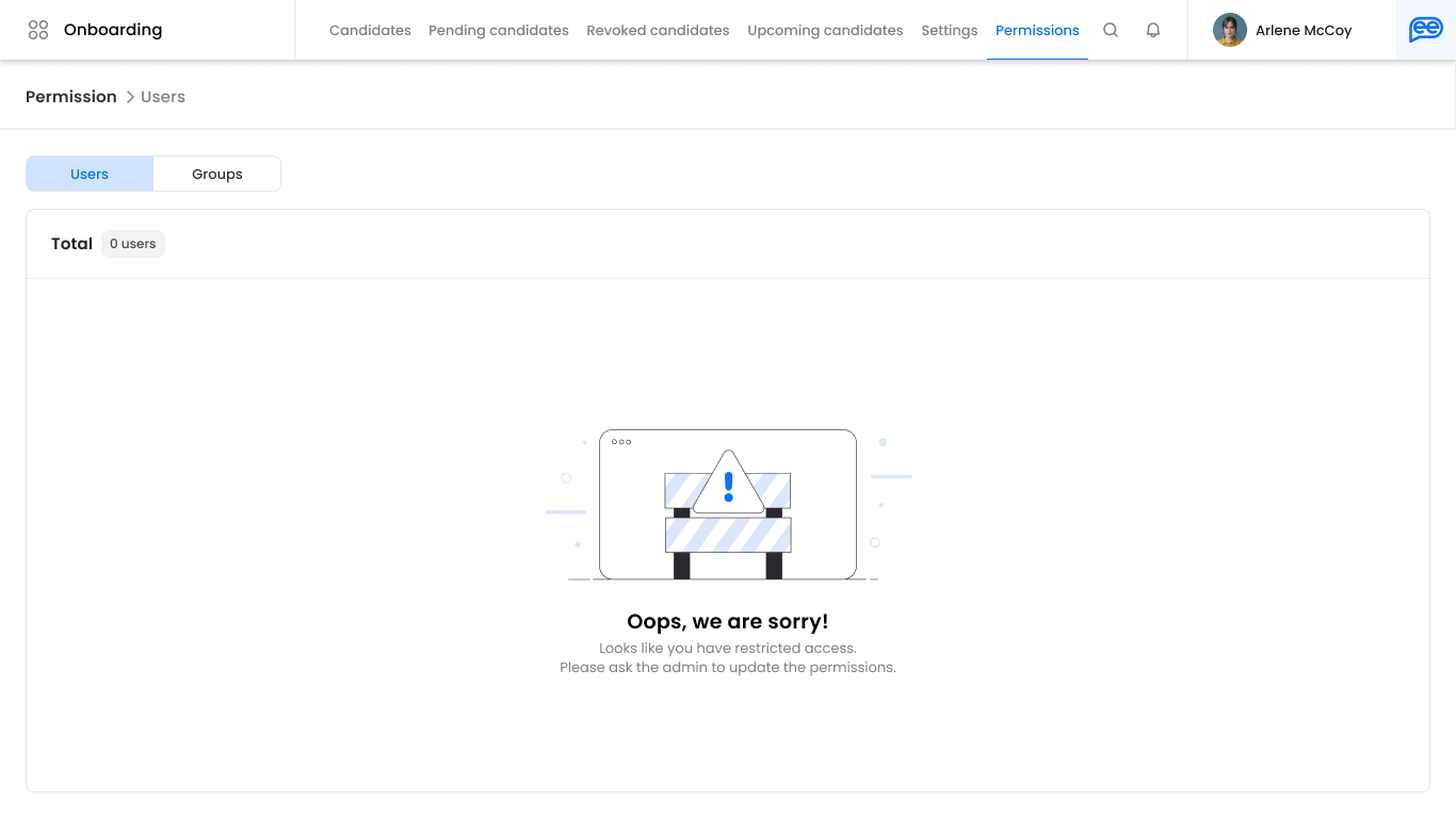 Onboarding Viewer Role: Users who are added as a viewer on the dashboard can only view the onboarding module from the left panel but when they open the module, they will not see any user and will get a message to contact Admin for more permission, as shown in the image below.