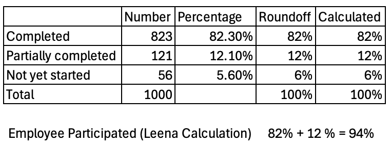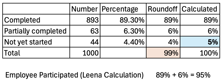 In all cases where we have a distribution of overall employees based on categories (like sentiment or participation) and we show percentage of employees in each category, we round the percentage to nearest integer to keep the UI clean. But, we also need to ensure that the sum is 100% and post rounding we might see the sum as 99% or 101% as a 1% margin or error is being introduced by this rounding.