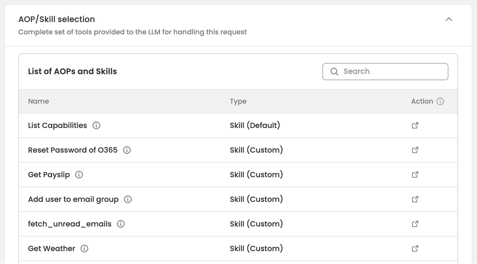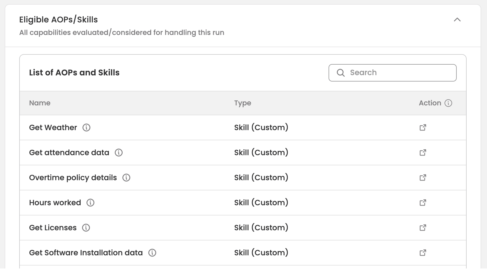 This table shows the final set of capabilities sent to the LLM and is similar to Eligible AOPs/Skills Table.