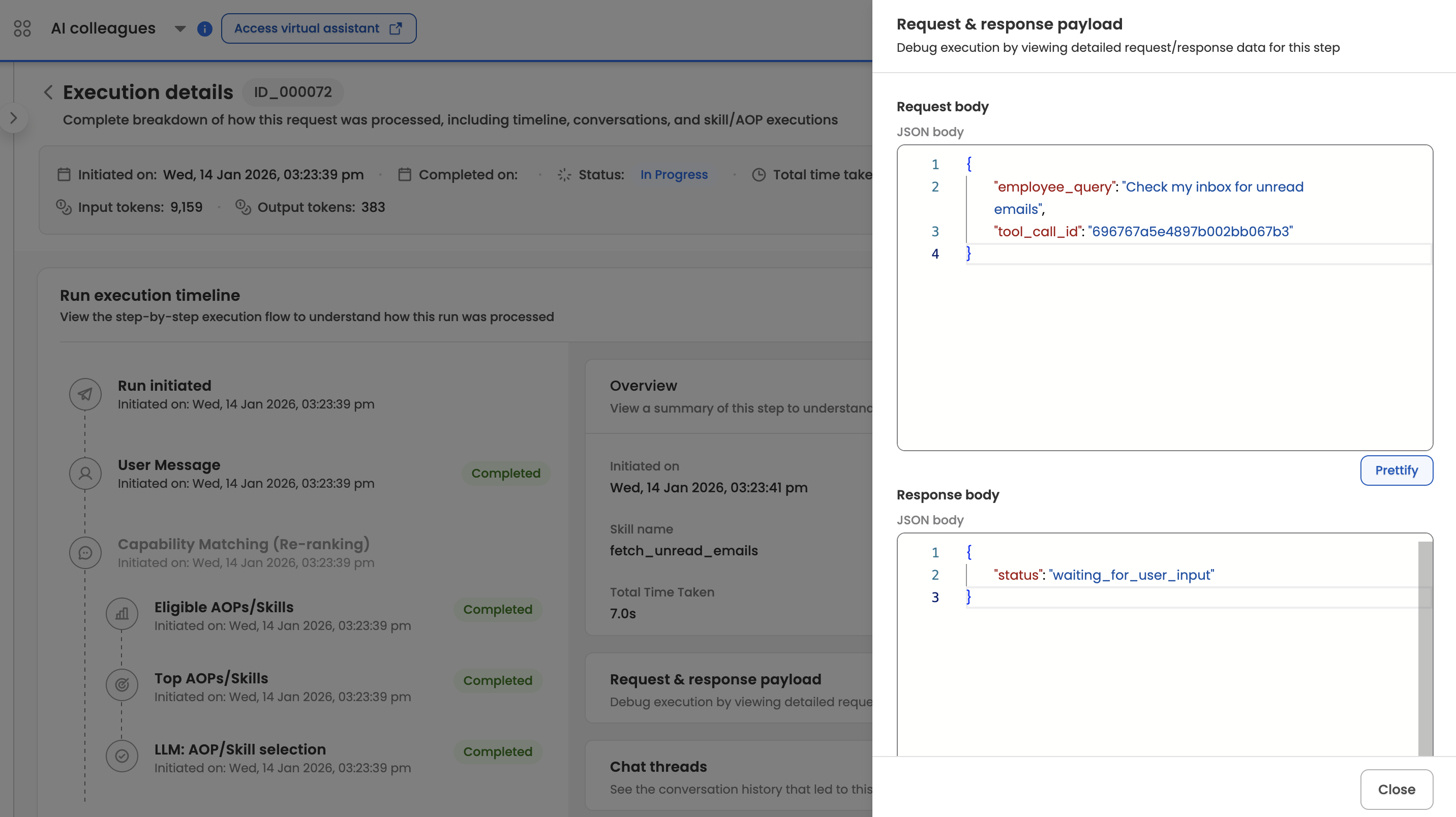 When viewing the execution details for any run, the Capability Matching section provides transparency into how the AI Colleague identified and selected the appropriate skills and AOPs to handle a user's request.