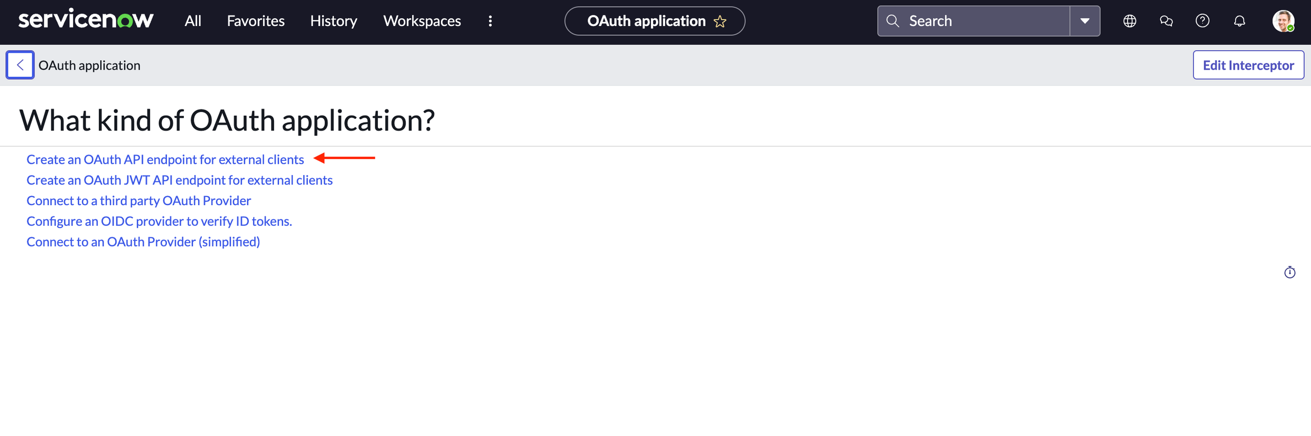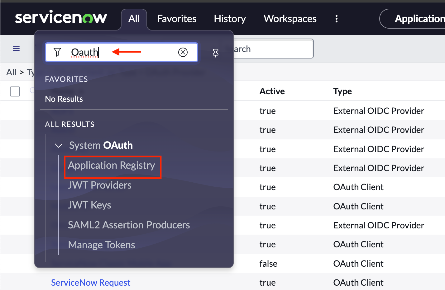 Go to your ServiceNow developer instance and select “Application Registry” under “System OAuth”.
