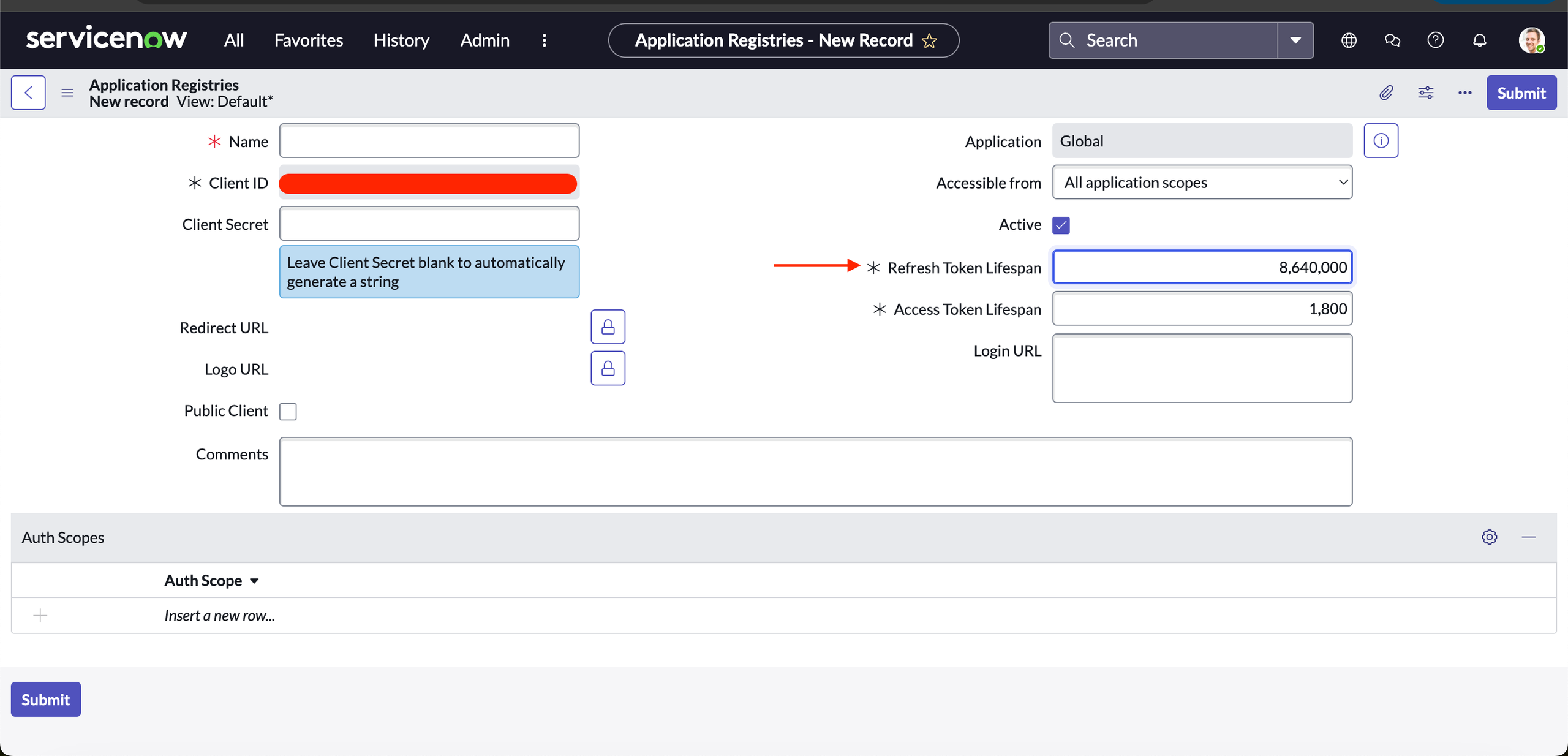 Q: How do I get a Client ID and Client Secret from ServiceNow? A: You must go to your ServiceNow developer instance and navigate to System OAuth > Application Registry. When you register a new application (for either the Token or Password-based method), ServiceNow will provide a Client ID and Client Secret.