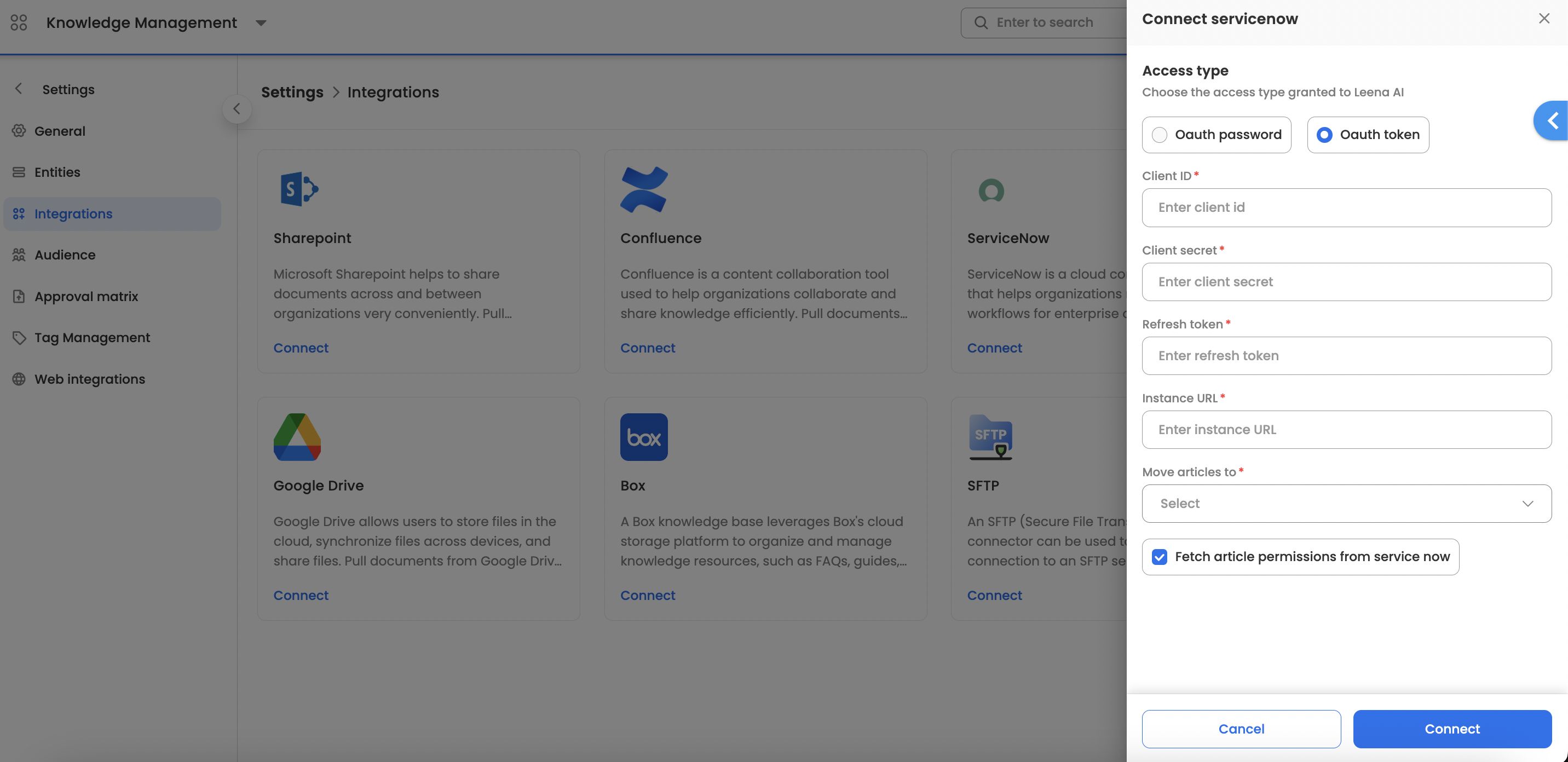 There are 2 approaches to connect the ServiceNow knowledge base with Leena KM via OAuth access.