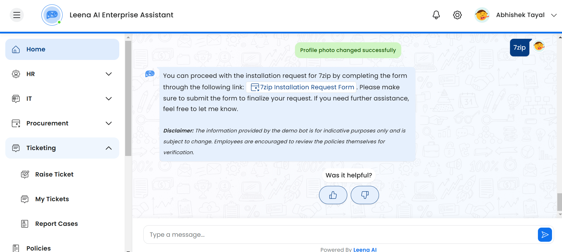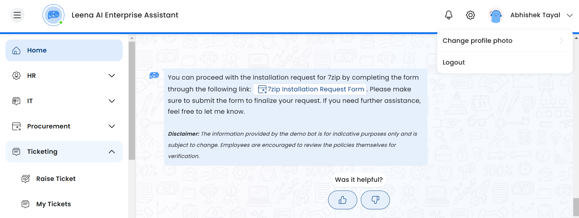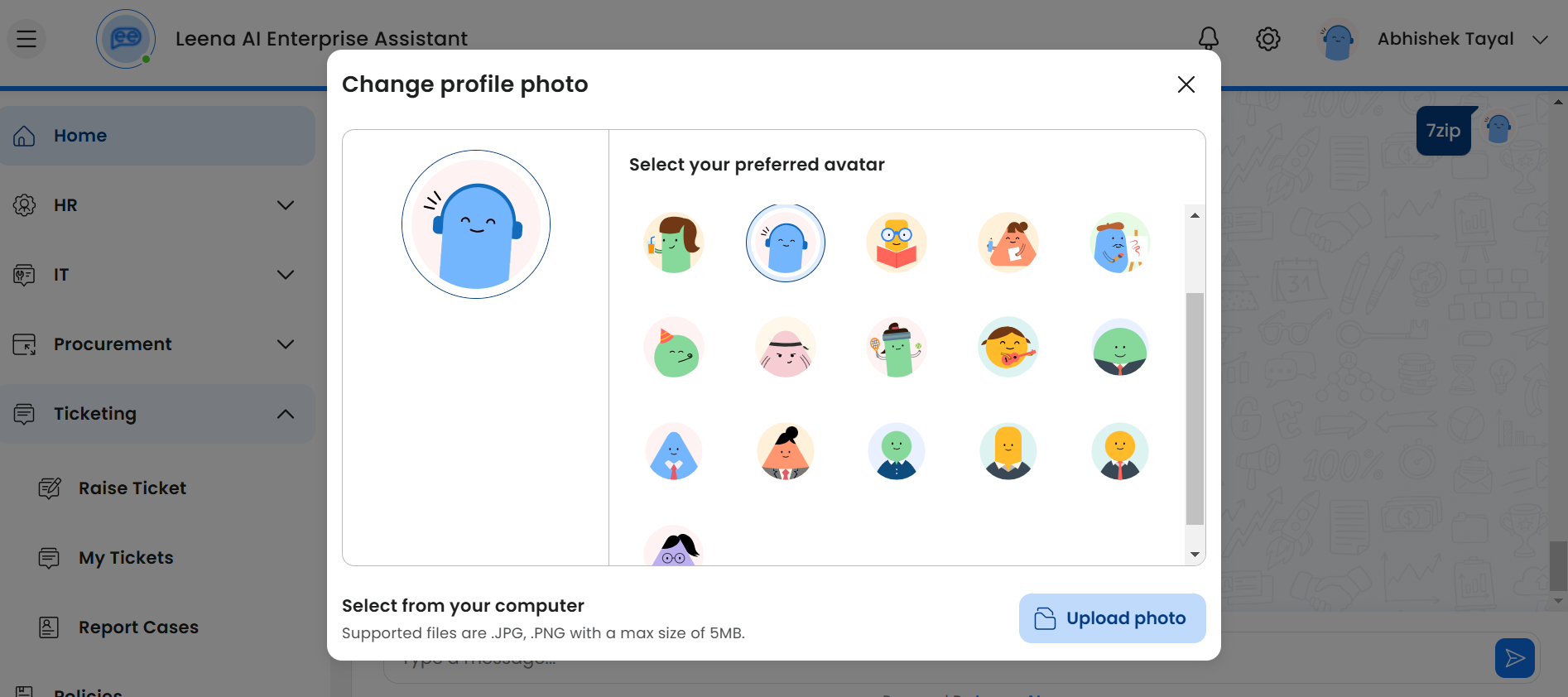 Change Profile Picture - Users can also change the default profile picture from an option of cool avatars or upload their own image to personalize their virtual assistant profile. The option is available under the user menu accessible by clicking on the user's name.