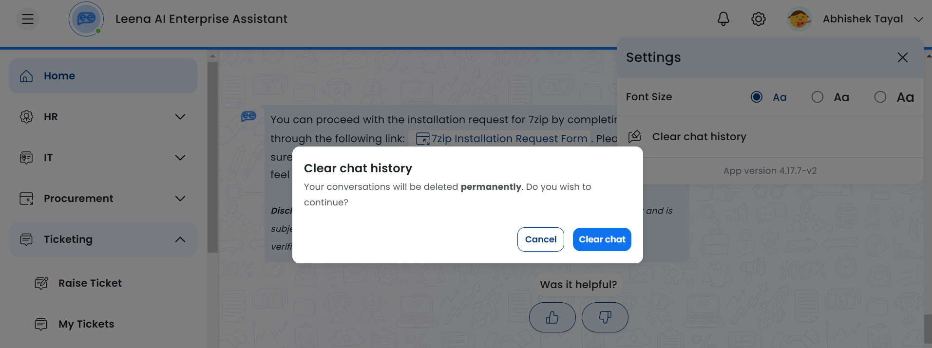Clear Chat - At any point, users can also kind of 'reset' the bot by using the 'Clear chat history' option from the settings gear. This will remove all conversation history for the user and will start the bot from the introduction messages again.