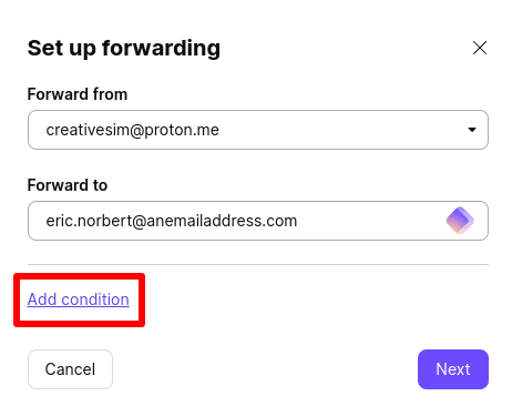 For more granular control over which emails are forwarded, you can specify conditions that must be met before the email is forwarded. To do this, select a Forward from and enter a Forward to email address (as above), then click Add condition.