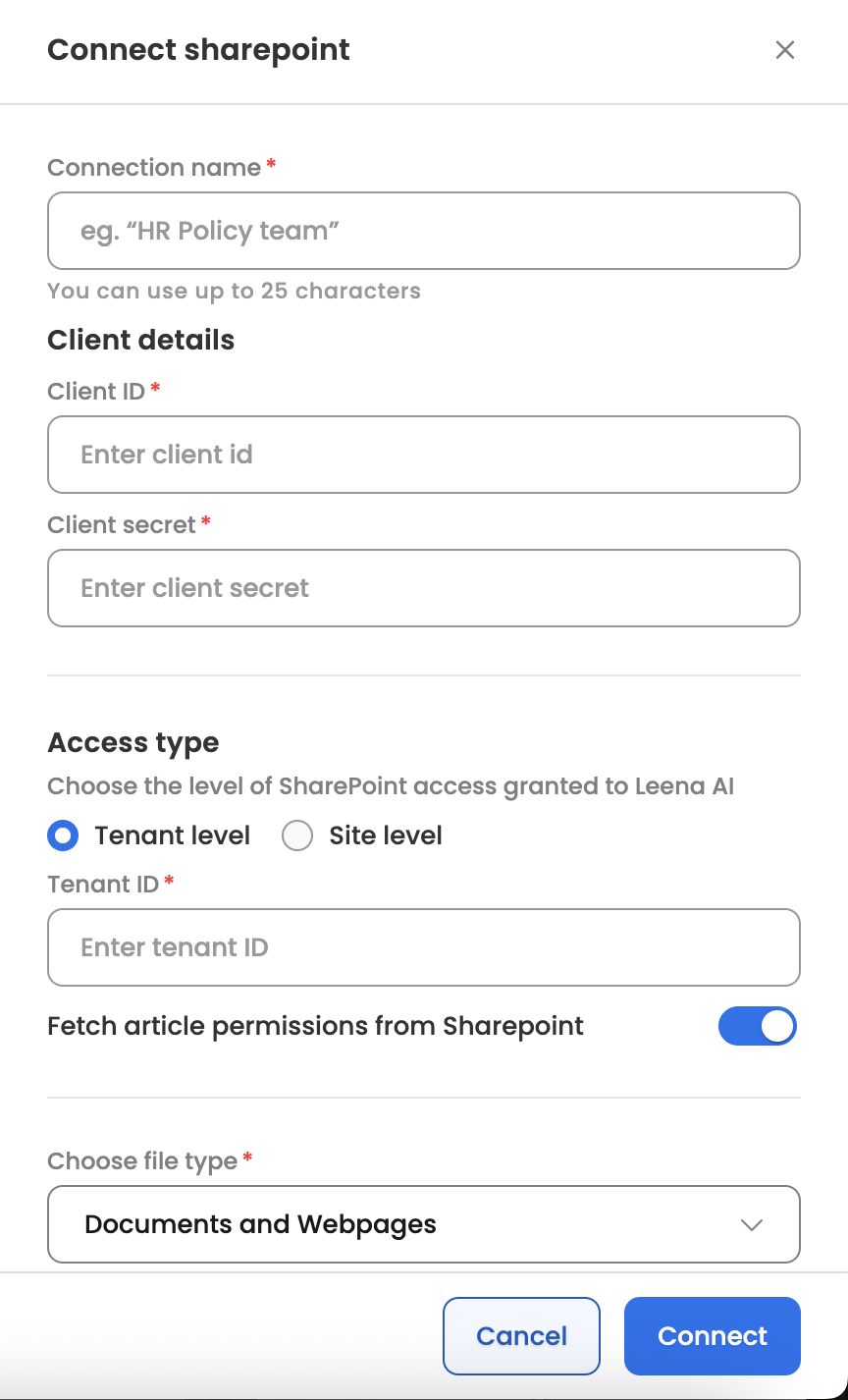 2. Go to the SharePoint connector settings in your Leena AI dashboard.