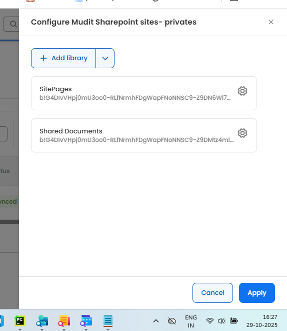 Metadata filtering of content: After Connecting to SharePoint sites, you could select 'Configure sites' and then provide metadata based on which you would want to filter content within SharePoint sites. For configuring sites, you will have to first select libraries and then configure the libraries based on the available options.