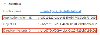 8. On the application's Overview page, copy the value of the Application (client) ID and Directory (tenant) ID and save them; you will need these values in the next step.