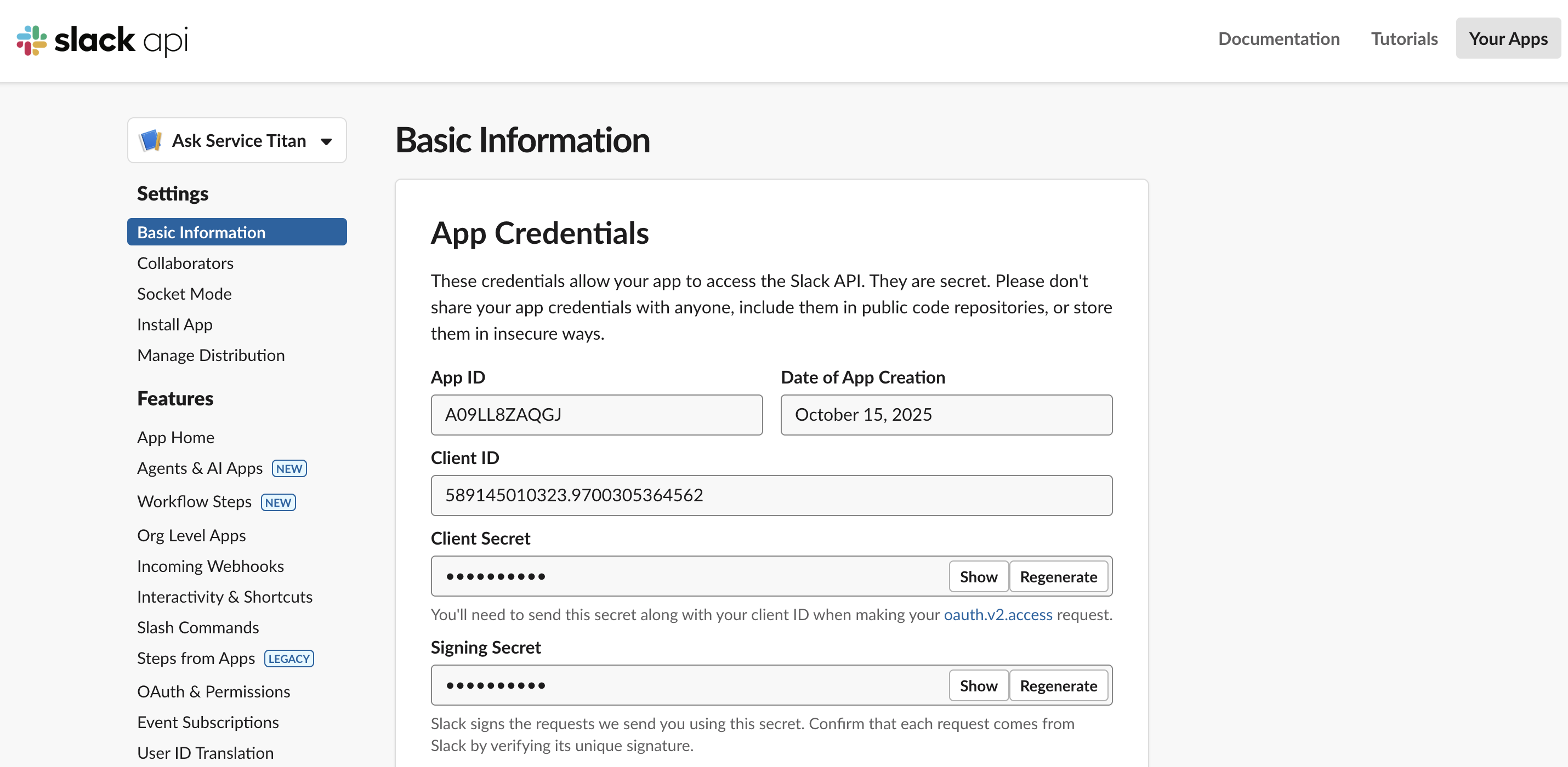 After creation, you will land on the app's Basic Information page in the Slack API portal.