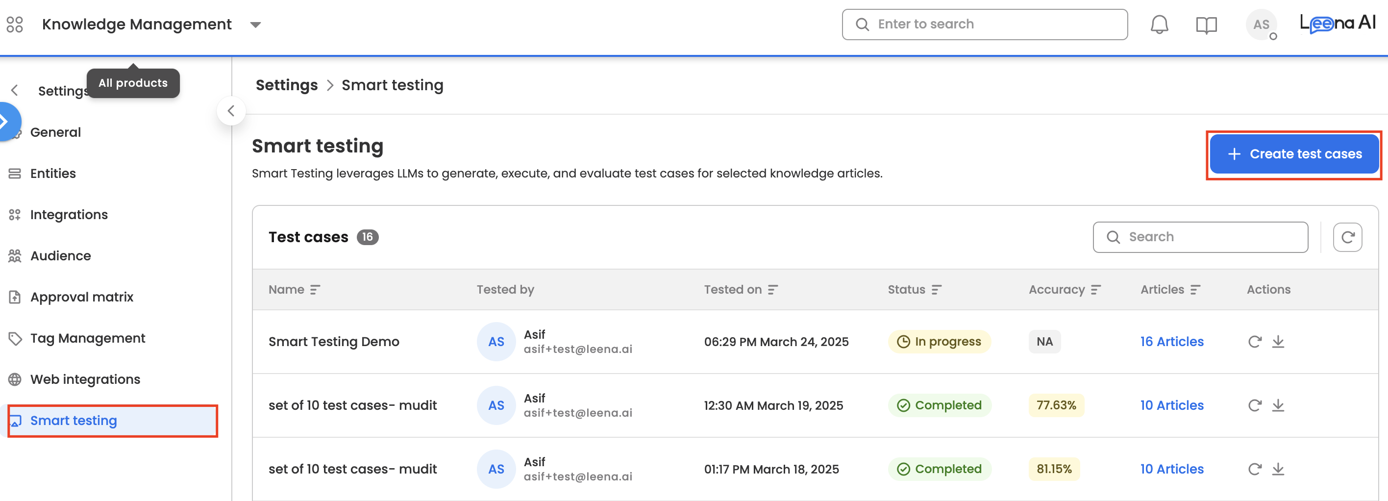 Smart Testing is a powerful feature that enables users to leverage LLMs for generating, executing, and evaluating test queries within Leena AI's Knowledge Management (KM) dashboard. It provides a seamless way to assess the accuracy of the KM agent, offering quick and valuable insights which can be further analysed to enhance its performance.