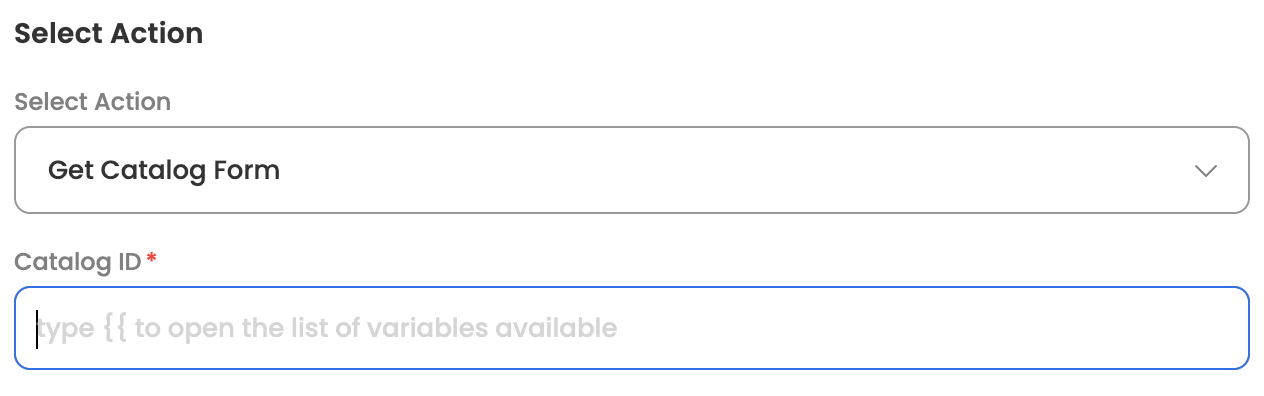 The action returns the form structure and required fields for the specified catalog item.