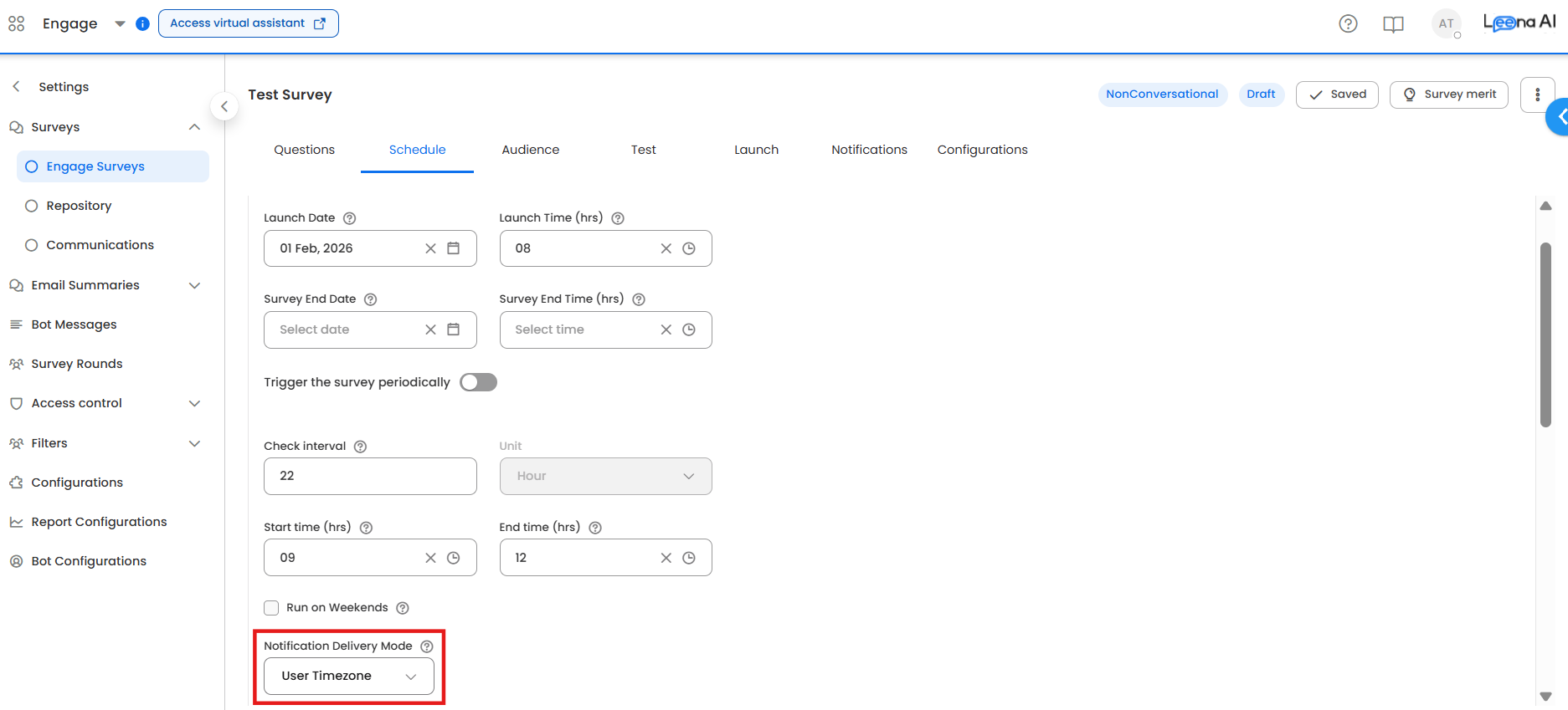 For enterprises working in a multi-geography setup, the employees can be in distributed timezone. This requires the survey launches to also happen as per employee's timezone in some cases to drive better adoption. The same can be configured at a survey level.