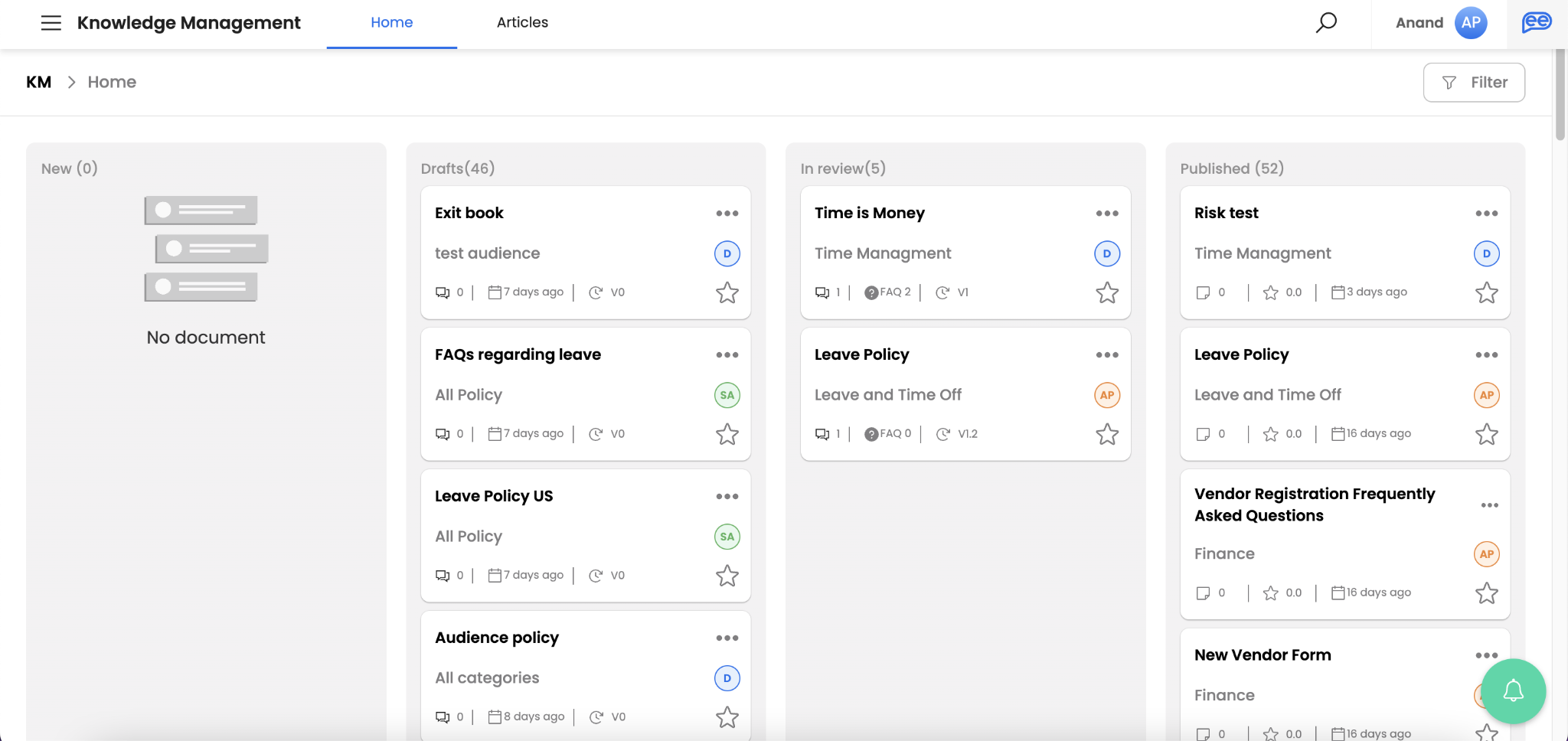 Only articles the user has access to will be displayed in the Kanban view of knowledge management. This view helps users manage the progress of articles from Draft to Published by knowing which articles are making good progress. For instance, easily identifying the articles needing attention, or those which require strong stakeholder follow up, and more.