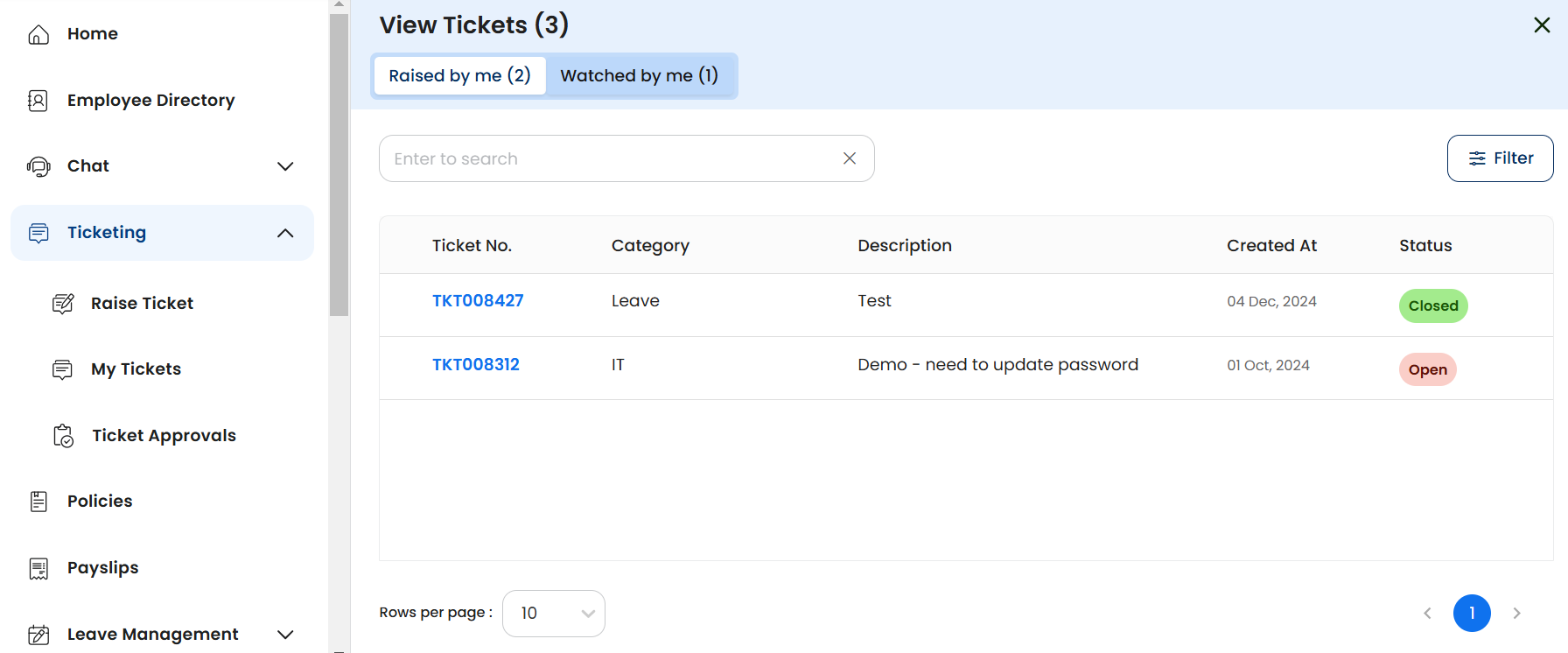 Users can view all tickets raised by them or where they are added as a watcher in a single place.