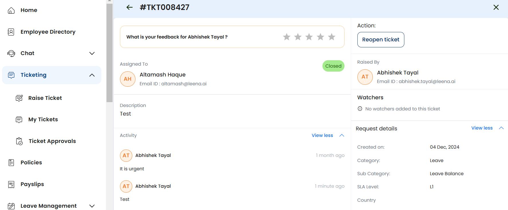 - Users can also enter specific tickets to view more details, see activity and add comments