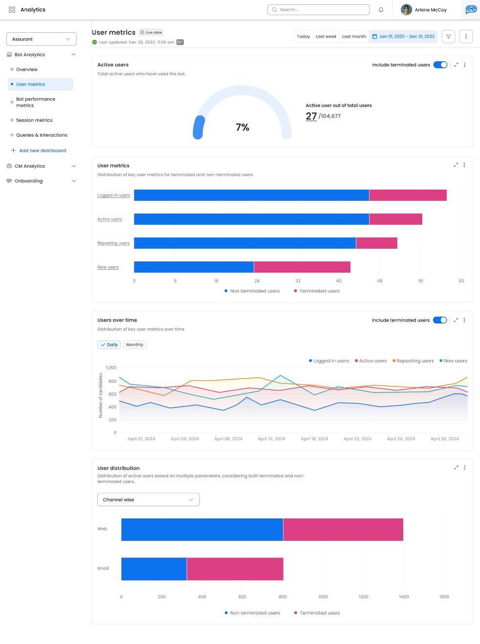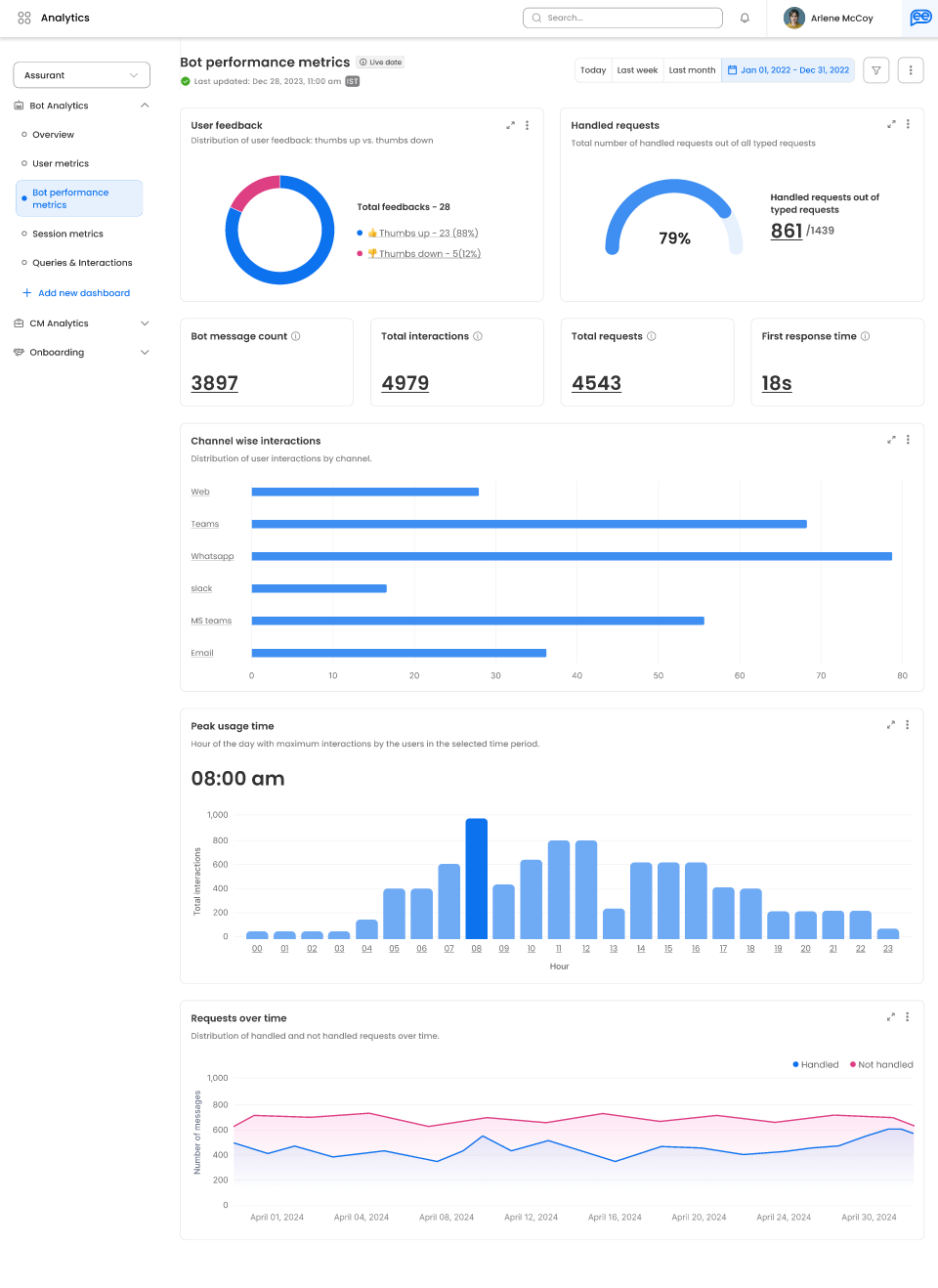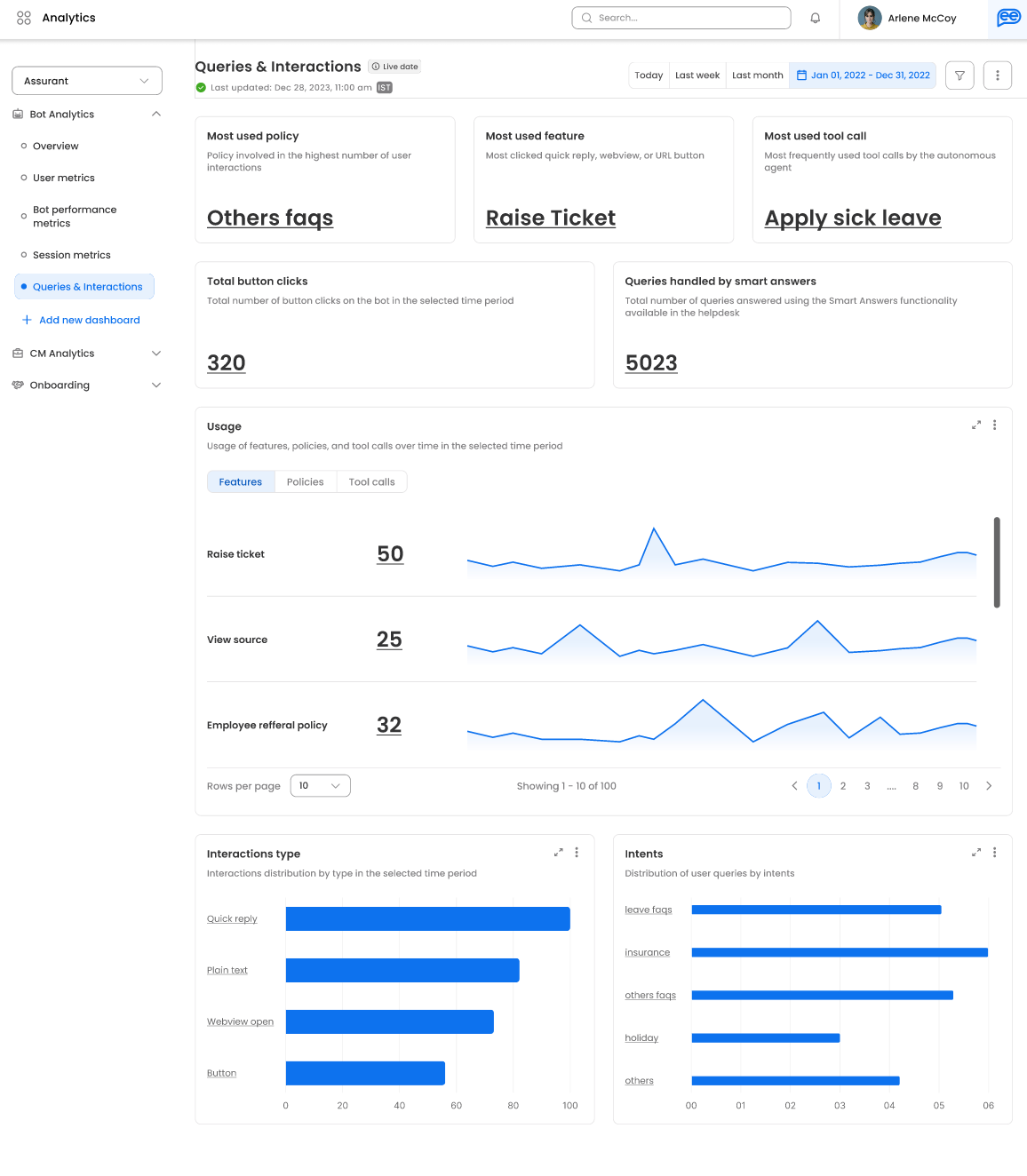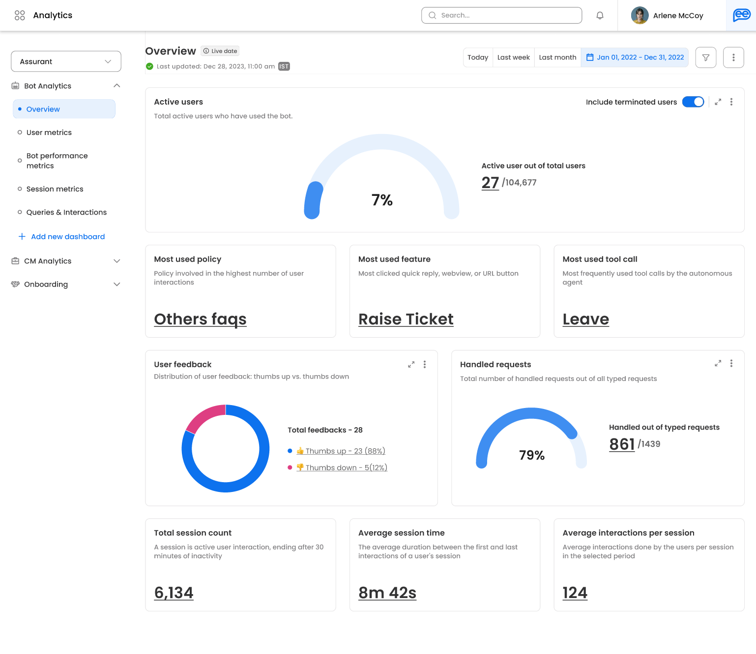 This dashboard consists of details related to the interactions and the queries from the users. It helps you to understand what are the most used features, the most searched policies, messages handled and not handled etc.