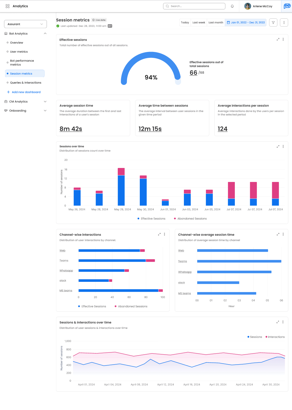 This dashboard helps you to deep dive in the Virtual Assistant usage to understand the Virtual Assistant-user interaction patterns. Use this dashboard to analyse the behaviour of user interactions with the Virtual Assistant in the selected time frame.