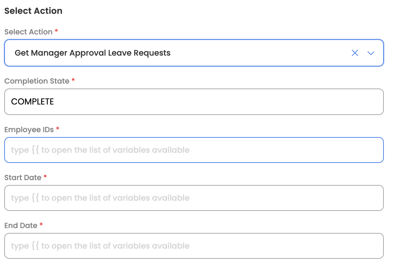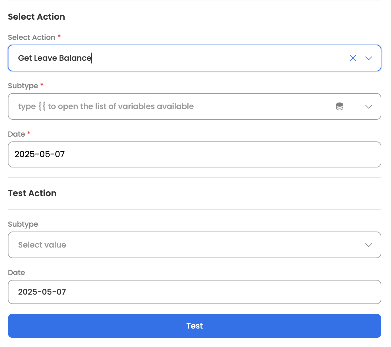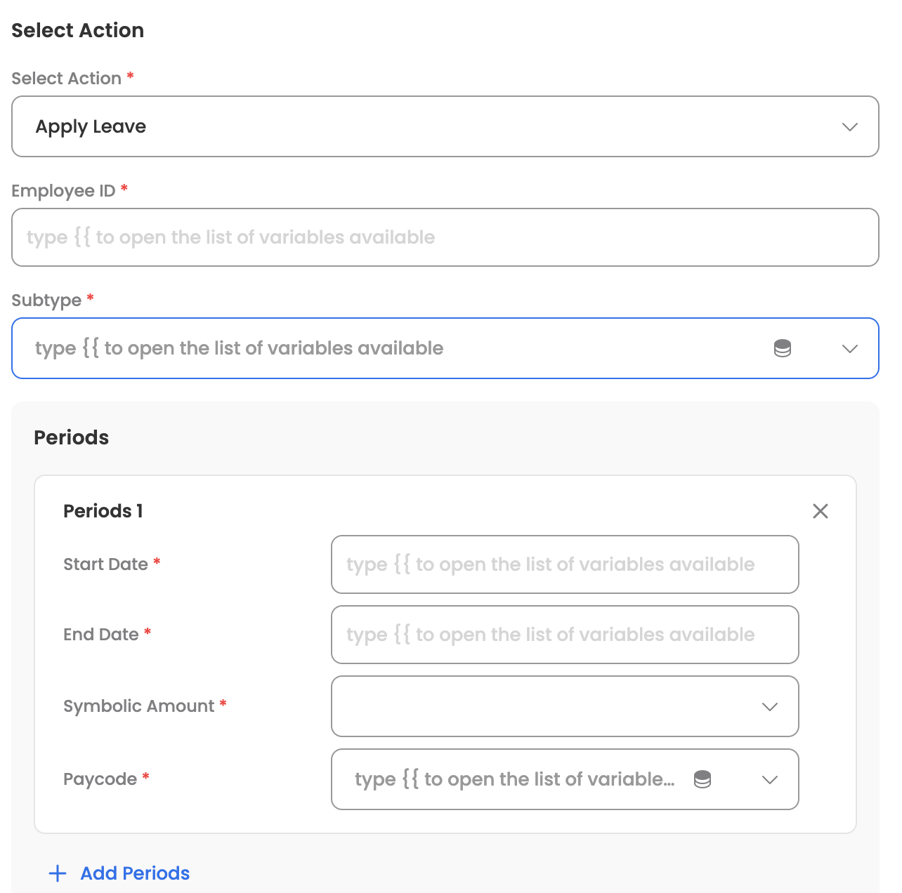 - The Pay Code ID and Request Sub-type ID values must be retrieved using the Get Request Sub-types action before creating a leave request.