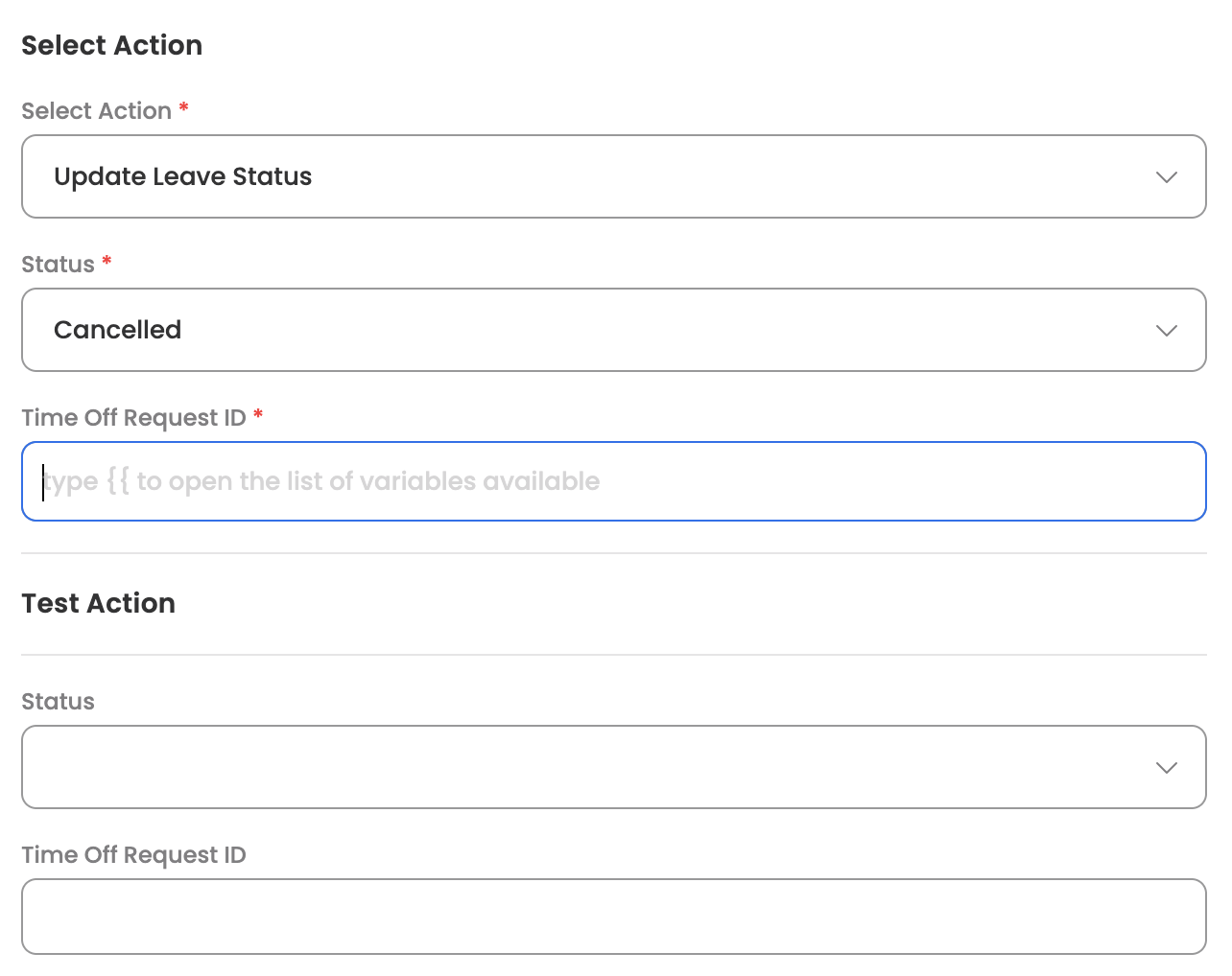 This action updates the status of a time-off request (can be used for approval/rejection/cancellation).