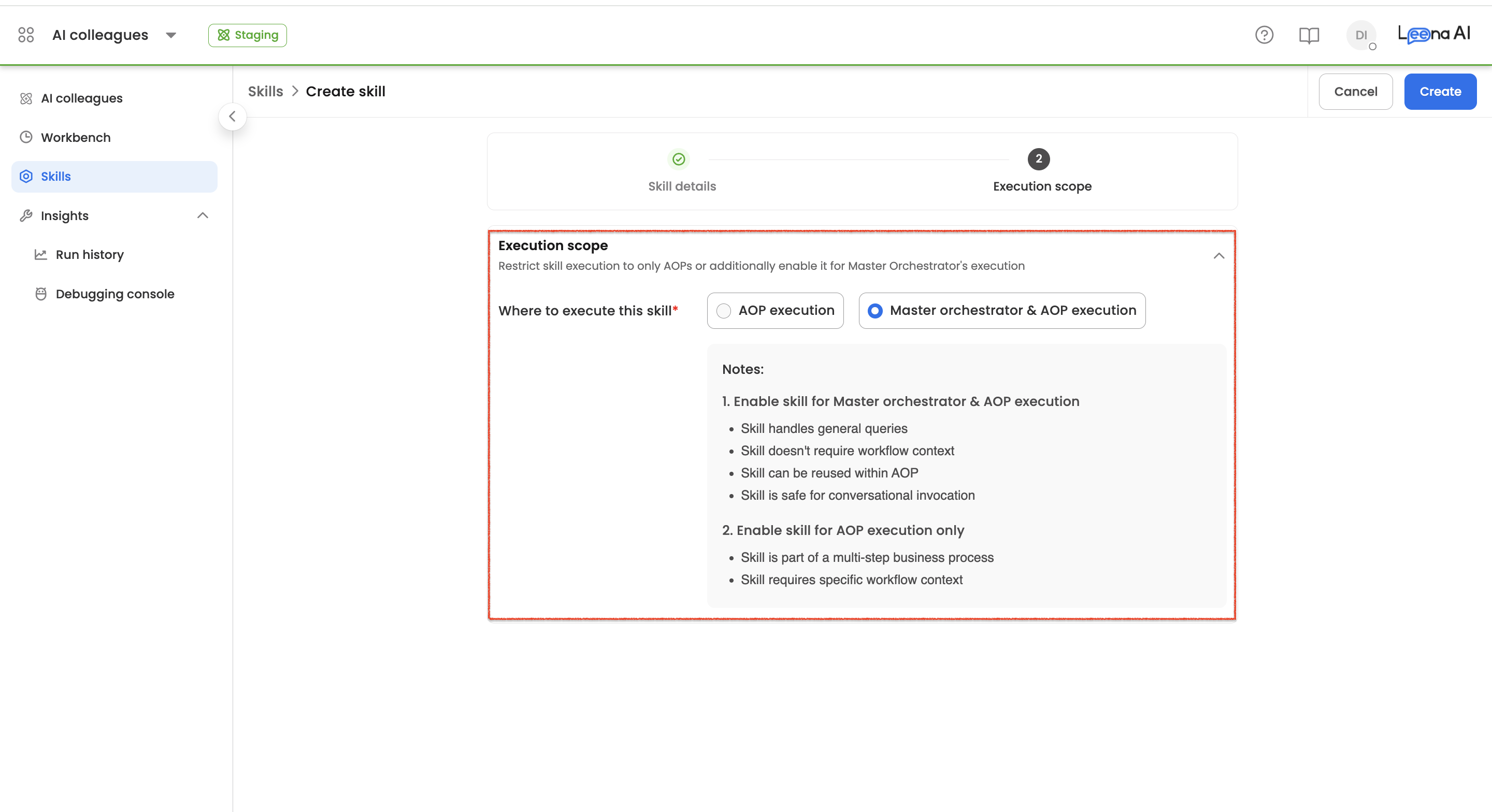 When creating or editing a skill, you must define its execution scope to control where the skill can be invoked.