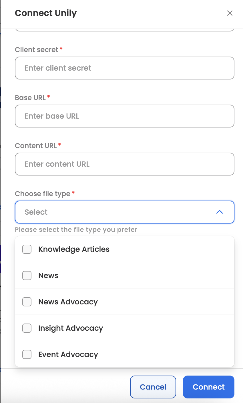 To begin the integration, navigate to Settings > Integrations > Unily > Connect. You will be required to configure the following five key fields to establish a secure data pipeline.
