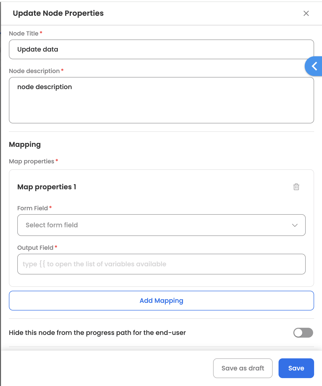 | Hide this node from the progress path for the end-user | Hide node under progress path which is visible to end-user/employee (through my-tasks or my-items) |